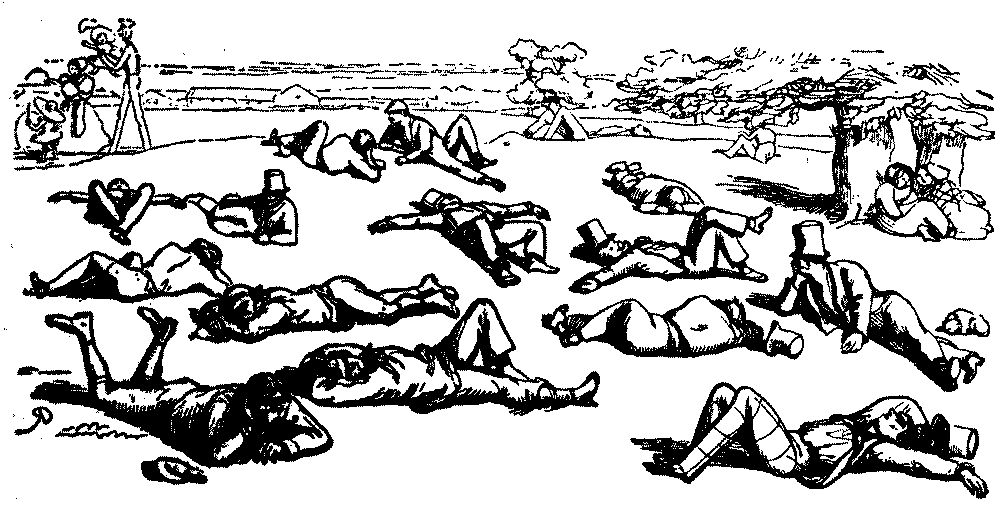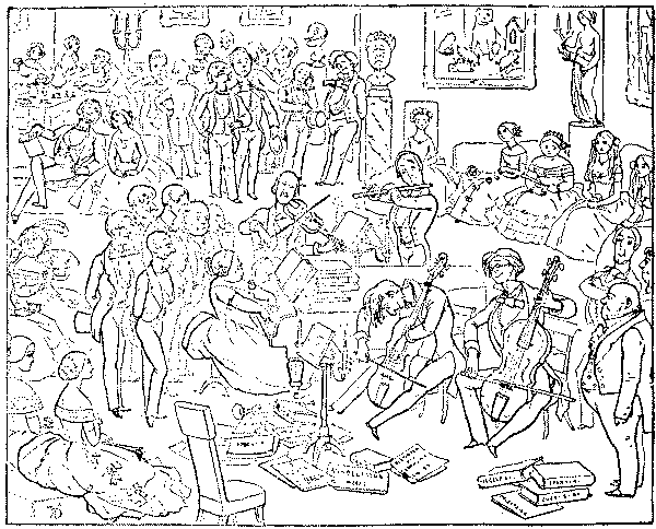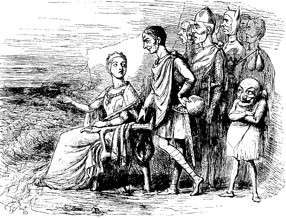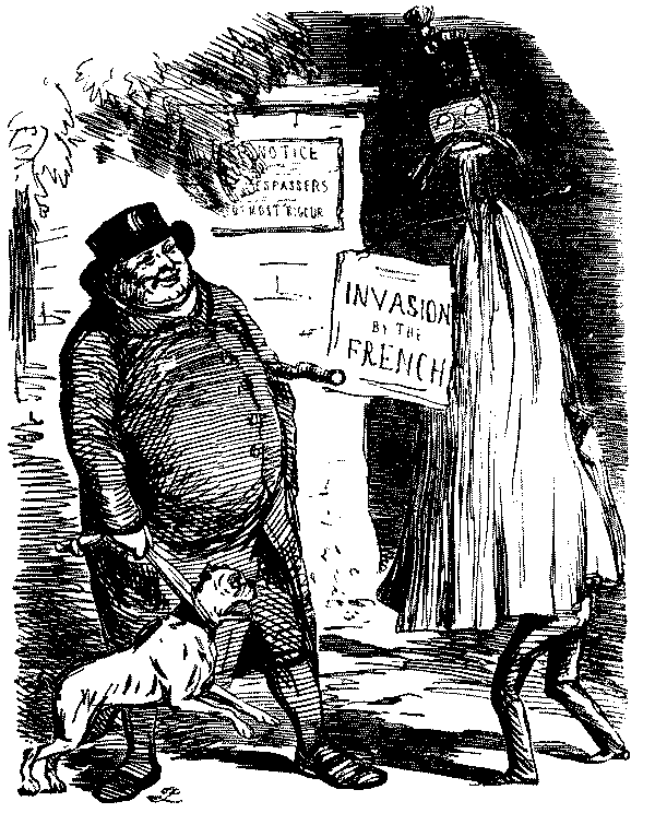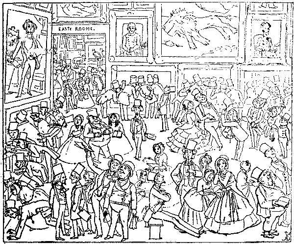 It may be added that when French medals were conferred on English artists in 1855, Punch complained that the newer school, i.e. the P.R.B.'s, had been overlooked in favour of Court painters such as Landseer. As a set-off to these examples of Punch's artistic and aesthetic flair and enlightenment, it must be owned that in 1854 he had expressed high praise for Frith's Ramsgate Sands (which was bought by the Queen) on account of its realism. But it may be accounted to him for righteousness that he supported Lord Stanhope's National Portrait Gallery Bill in 1856, and entered a vigorous protest against the vile "Germanism" of the title "Art Treasures Exhibition" instead of "Treasures of Art" for the show at Manchester in 1857. The more modern and equally vile Germanism "Concert-Direction Smith" or whoever the musical agent may be, has apparently been washed out by the War of 1914.