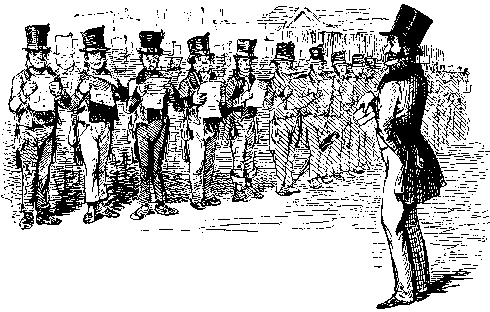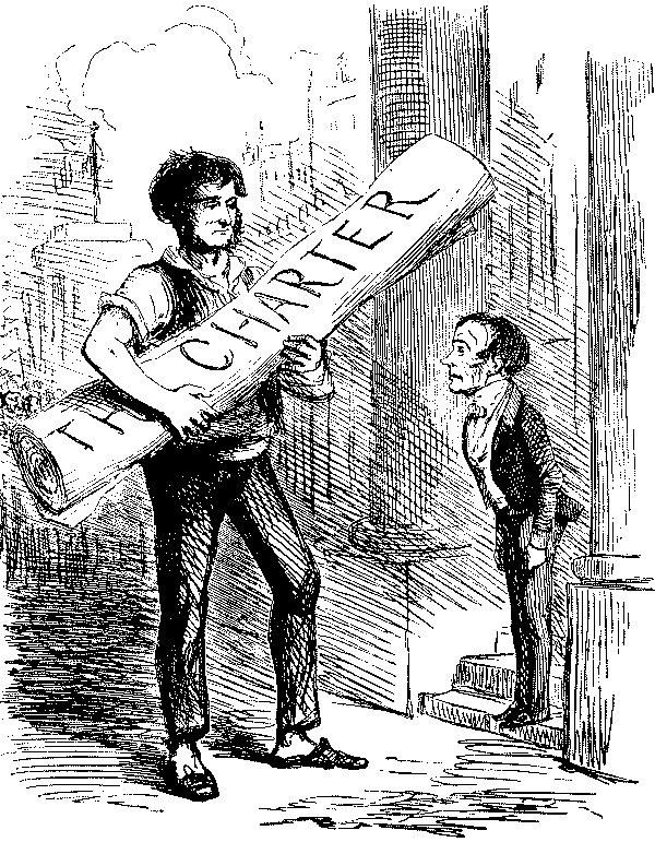 Punch had no illusions as to the genuineness of the Chartist movement, as may be gathered from his comments on the presentation of the Great Petition in 1842. There might, he owned, be dangerous demagogues who offered evil counsel, but[Pg 10] the Chartists themselves had a degree of intelligence, a power of concentration, a knowledge of the details of public business, heretofore unknown to great popular combinations of dissentients:—