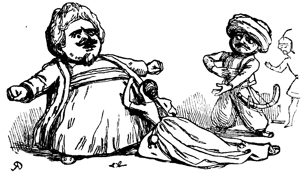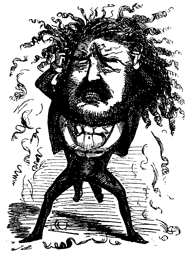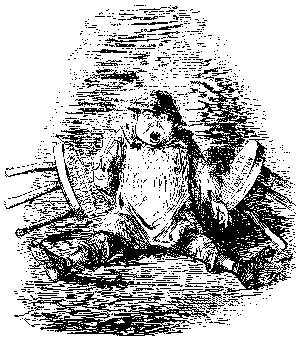 If "Jenkins" was Punch's "chief butler"—in the sense of the supreme flunkey—Lord Brougham was his chief butt[Pg 308] throughout these years. And certainly no public character in the nineteenth century ever played better into the hands of the satirist. His nose in the most literal sense lent a handle to the caricaturist. His tweed trousers figure as regularly in Punch's portraits as the straw in Palmerston's mouth—which, by the way, is generally traced to a trick that "Pam" acquired in visiting his stables. Palmerston's nickname was "Cupid" from his gallantry: the mythological parallel for Brougham would have been Proteus. One of the earliest references to him in Punch appears in the composite Preface to Vol. vi., in which each of the contributors ascribes to Punch his own characteristics, Brougham praising him for "forswearing like a chameleon every shade of opinion, when for the moment he has ceased to wear it." Thereafter the fun becomes fast and furious. Brougham is charged with writing the flamboyant advertisements of George Robins, a veritable Barnum among auctioneers. His tweed trousers are explained as a cause of his always wanting to get back to the woolsack. He is credited, in virtue of his versatile activities, with the attempt to discover perpetual motion. Brougham's vanity, craving for office at all costs, meddlesomeness, and subservience to the Duke of Wellington are held up to contempt, and in "Rational Readings for Grown-up People" (an early anticipation of the Missing Word Competition) we read:—