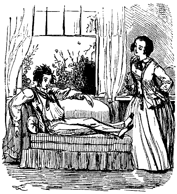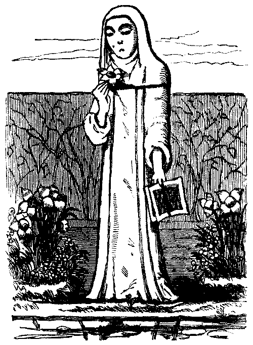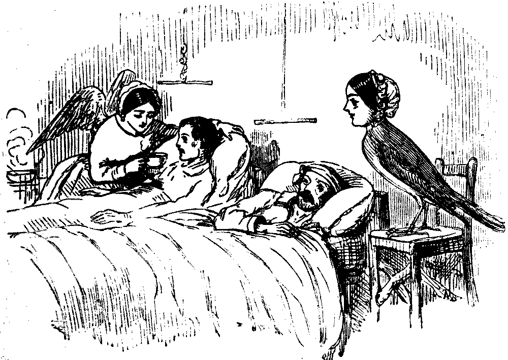 Our dear and promising young friends, the Pre-Raphaelites, deserve especial commendation for the courage with which they have dared to tell some most disagreeable truths on their canvases this year. Mr. Ruskin was quite right in taking up the cudgels against The Times on this matter. The pictures of the P.R.B. are true, and that's the worst of them. Nothing can be more wonderful than the truth of Collins's representation of the Alisma Plantago, except the unattractiveness of the demure lady, whose botanical pursuits he [Pg 300]has recorded under the name of CONVENT THOUGHTS.... By the size of the lady's head he no doubt meant to imply her vast capacity of brains—while by the utter absence of form and limb under the robe, he subtly conveys that she has given up all thoughts of making a figure in the world.