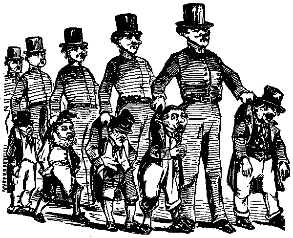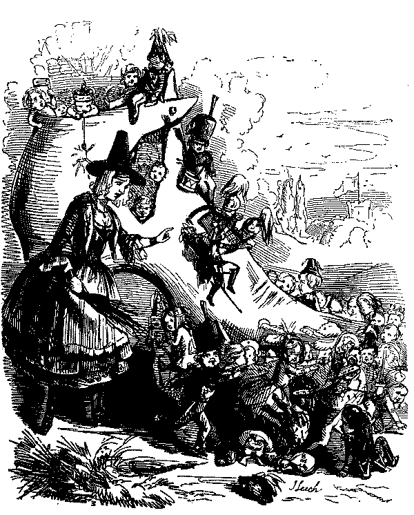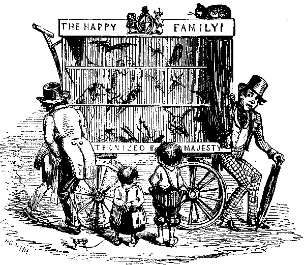 It is fitting that a chronicle of social life in England in the Victorian age, drawn in its essentials from the pages of Punch, should begin with the People. For Punch began as a radical and democratic paper, a resolute champion of the poor, the desolate and the oppressed, and the early volumes abound in evidences of the miseries of the "Hungry 'Forties" and in burning pleas for their removal. The strange mixture of jocularity with intense earnestness which confronts[Pg 4] us on every page was due to the characters and antecedents of the men who founded and wrote for the paper at its outset. Of at least three of them it might be said that they were humanitarians first and humorists afterwards. Henry Mayhew, one of the originators and for a short time joint-editor, was "the first to strike out the line of philanthropic journalism which takes the poor of London as its theme," and in his articles in the Morning Chronicle and his elaborate work on London Labour and the London Poor, which occupied him intermittently for the best part of twenty years, showed himself a true forerunner of Charles Booth. His versatility was amazing. The writer of the obituary notice of him in the Athenæum observes that "it would not be difficult to show him as a scientific writer, a writer of semi-religious biography, and an outrageous joker at one and the same time." Another member of the original staff was Gilbert à Beckett, who crowded an extraordinary amount of work into his short life as leader-writer on The Times, comic journalist, dramatist, Poor Law Commissioner and Metropolitan Magistrate. It was à Beckett's report on the scandal connected with the Andover Union—pronounced by the Home Secretary, Buller, to be one of the best ever presented to Parliament—that led to important alterations in the Statute book, and secured for him, at the age of thirty-eight, his appointment as Metropolitan Police Magistrate. Thackeray's references to "à Beckett the beak" are frequent and affectionate, and on his death in 1856 a noble tribute was paid him in the pages of the journal he had served from its opening number. "As a magistrate, Gilbert à Beckett, by his wise, calm, humane administration of the law, gave a daily rebuke to a too ready belief that the faithful exercise of the highest and gravest social duties is incompatible with the sportiveness of literary genius." These words were penned by Douglas Jerrold, who died within a year of his friend, and was the most ardent and impassioned humanitarian of the three. By the irony of fate Jerrold is chiefly remembered for his sledge-hammer retorts: the industrious and ingenious playwright is little more than a name; the brilliant publicist and reformer, the friend and associate of Chartists, the life-long[Pg 5] champion of the underdog is forgotten. Gilbert à Beckett and Henry Mayhew had both been at Westminster. Their people were well-to-do. Douglas Jerrold had known both poverty and privation, and his education was largely acquired in a printer's office. His brief service in the Navy was long enough to make him a strenuous advocate of the claims of the lower deck to more humane treatment. He did not believe that harsh discipline and flogging were necessary to the efficiency of either Service. As a boy he had seen something of the human wreckage of war, and the spectacle had cured him for ever of any illusions as to militarism. But his distrust of Emperors, Dictators and the "King business" generally—always excepting Constitutional Monarchy—was so pronounced that any interference on their part was enough to convert him into a Jingo. How far he was from being a pacificist may be judged from the temper of Punch in the Crimean War, its advocacy of ruthlessness as the best means of shortening the hostilities, and its bitter criticism of Lord Aberdeen and Mr. Gladstone, and above all of Cobden and Bright, for their alleged pro-Russian sympathies. In the 'forties Cobden and Bright were the leaders of that group of "middle-class men of enthusiasm and practical sagacity" which directed the Free Trade movement, and they had been supported by Punch in the campaign against the Corn Laws. Douglas Jerrold was the spear-head of Punch's attacks on Protection, Bumbledom, unreformed Corporations, Cant and Snobbery, the cruelty, the inequality, the expense and the delays of the Law. He might be described as being violently and vituperatively on the side of the angels. The freedom of his invective, notably in the articles signed "Q," is beyond belief. Compared with his handling of ducal landlords, the most drastic criticisms of Mr. Lloyd George in his earlier days are as water to wine. At all costs Jerrold was determined that the Tory dogs should not have the best of it.