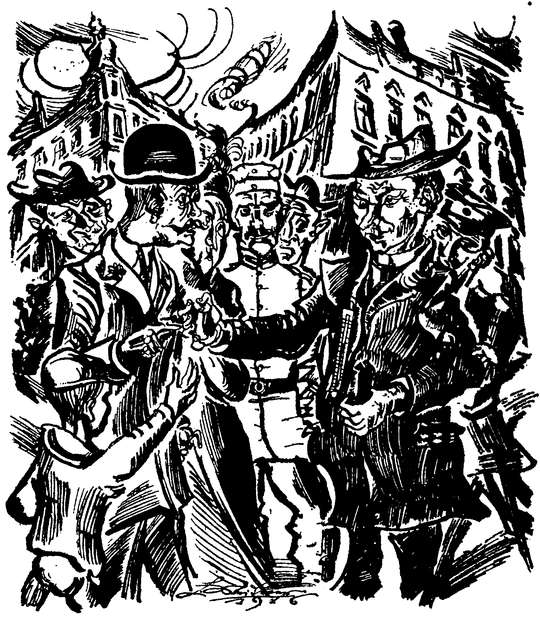 Als Pschorr sich wieder ins Freie begab, legte er noch einige Eleganz in diese Präzision, indem er absichtlich einen Posten wieder vom Bann befreite und ihn dann, wie oben, ins Gebet nahm. Dann riß er sich draußen sofort die Maske vom Antlitz und ging in langsamstem Tempo zum „Elephanten“. Er freute sich; er hatte, was er gewollt hatte. Gleich am andern Morgen reiste er zurück.