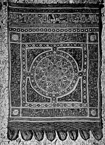 Another most interesting example of Saracenic textile work is the so-called “banner of Las Navas” (Plate i.), which popular tradition affirms to have been captured (a.d. 1212) in the memorable battle of Las Navas de Tolosa, between the Almohades and the Spanish Christians. Most experts now consider that this object is not a military ensign, but a curtain or some other hanging for a tent or doorway. The material is sirgo or silken serge, and both the decoration and the workmanship are purely Moorish. The design is rich and intricate throughout, consisting of scrolls, leaves, stems, and inscriptions from the Koran, disposed with exquisite effect about the principal and central motive, formed by a large eight-pointed star within a circle, and which contains, so as to form the angles of the star, eight repetitions of the words in Arabic, “The Empire.” The dominant colour is carmine, and the fabric terminates in eight farpas or scallops with red and yellow edges, and bearing a series of inscriptions in the African character.