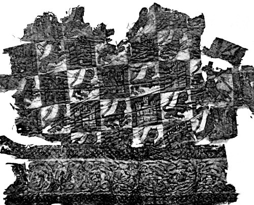 The Royal Academy of History at Madrid possesses a fragment of the costly fabric known as tiraz, an eastern word (corrupted by the Spaniards into taracea, i.e. embroidery on clothing), which means the bordering for a royal robe. Such bordering, which contained inscriptions, or the sultan's name, or both together, is said to have been first used in Spain by Abderrahman the Second, who ruled from a.d. 825 to 852. “The caliphs of Cordova,” says Riaño, “had a place set apart in their palaces where this stuff was kept: this custom lasted until the eleventh century, when it disappeared, and was re-established in the thirteenth century with the kings of Granada.” Tiraz, in fact, was both produced and stored in special departments of the Sultan's palaces[7]; or so we[21] must infer from the following passage by Ibn-Khaldun. “The places (almedinas) where these stuffs were woven were situated within the palaces of the caliphs, and were known as the ‘pavilions of the tiraz.’ The person at the head of these workshops was called the superintendent of the tiraz: he had charge of both the weavers and the looms, administered the salaries, and looked to the quality of the work. This post was entrusted by the princes to one of the foremost officers of their kingdom, or else to some freedman who thoroughly deserved their confidence.” The same historian adds that the manufacture of tiraz was conducted in Spain in the same manner as in the East under the dynasty of the Ommeyades. It is, however, certain that among the Spanish Moors tiraz was not produced exclusively in royal factories. Al-Makkari states that in the time of the Somadies and the Almoravides there were[22] looms at Nerja (and possibly at Almería) for weaving this luxurious fabric, as well as holas, a fine brocade, heavily embroidered, and adorned with figures representing the caliphs and other personages. In the time of the Almoravides there were at Almería as many as a thousand factories for making holas.