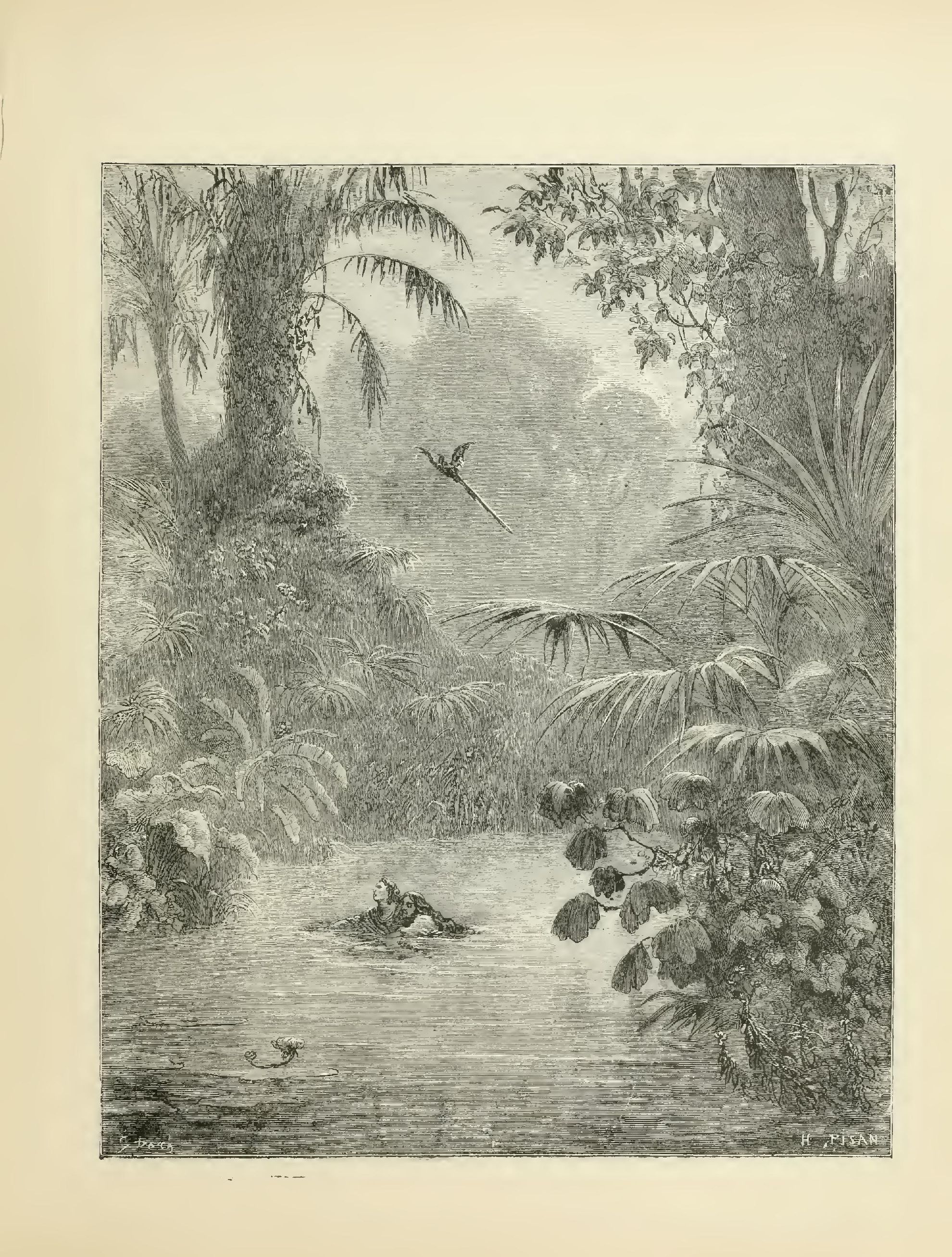 If all is silence and repose in the savannahs on the other side of the river, all here, on the contrary, is sound and motion; peckings against the trunks of the oaks, frictions of animals walking along as they nibble or crush between their teeth the stones of fruits, the roaring of the waves, plaintive cries, dull bellowings and mild cooings, fill these deserts with a tender yet wild harmony. But when a breeze happens to animate these solitudes, to swing these floating bodies, to confound these masses of white, blue, green, and pink, to mix all the colors and to combine all the murmurs, there issue such sounds from the depths of the forests, and such things pass before the eyes, that I should in vain endeavor to describe them to those who have never visited these primitive fields of Nature.
