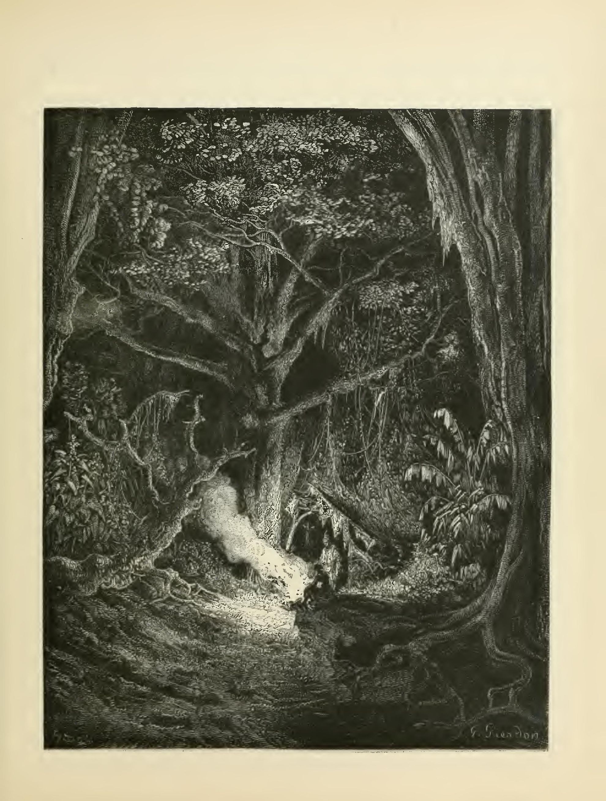 A multitude of animals, placed in these retreats by the hand of the Creator, spread about life and enchantment. From the extremities of the avenues may be seen bears, intoxicated with the grape, staggering upon the branches of the elm-trees; cariboos bathe in the lake; black-squirrels play among the thick foliage; mocking-birds, and Virginian pigeons not bigger than sparrows, fly down upon the turf, reddened with strawberries; green parrots with yellow heads, purple woodpeckers, cardinals red as fire, clamber up to the very tops of the cypress-trees; humming-birds sparkle upon the jessamine of the Floridas; and bird-catching serpents hiss while suspended to the domes of the woods, where they swing about like the creepers themselves.