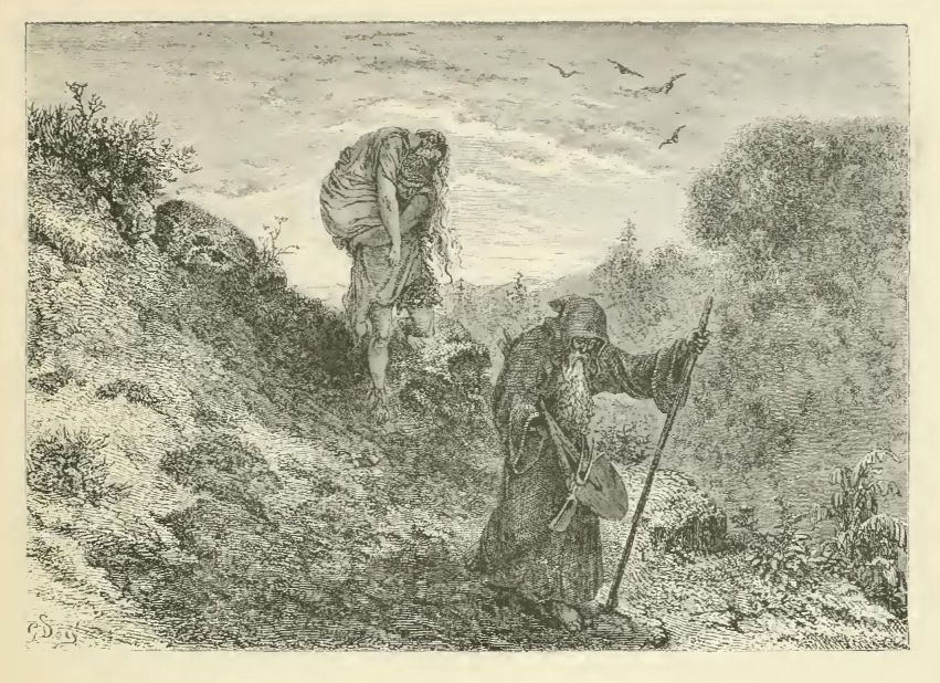 “Nevertheless, a bar of gold was forming in the east. The sparrow-hawks were crying upon the rocks, and the martins creeping back into the hollows of the elm-trees: these were so many signs that the time had come for Atala’s interment. I took the body on my shoulders; the hermit walked in front of me, carrying a spade in his hand. We commenced the descent from rock to rock; old age and death combined equally to slacken our pace. At the sight of the dog which had found us in the forest, and which now, jumping with joy, led us by another route, I melted into tears. Atala’s long hair, the plaything of the morning breezes, frequently threw its golden veil over my eyes, and, bending beneath the burden, I was obliged to lay it down often upon the moss, and sit awhile, to recover my strength. At length we arrived at the spot selected by my grief, and we entered beneath the arch of the bridge. O my son, you should have seen the youthful savage and the old hermit, on their knees in front of each other, in the desert, digging with their hands a grave for the poor girl whose body lay stretched out close at hand, in the dried-up bed of a torrent!