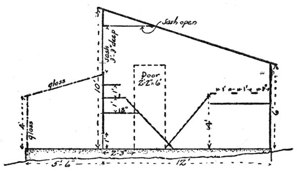 Directly in front, and extending the length of the building, is a glass-inclosed sun room four feet high and five feet wide.19 One end of this has a door to allow for the cleaning of the floor. The concrete floor of the main room extends into the sun room. Three openings, ten inches wide and one foot high, connect this sun room with the main room, and are provided with slides to be closed at night when the sun room is no longer a warm place.