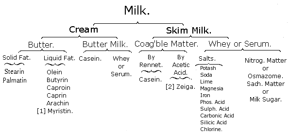 We will begin with the composition of milk. From hundreds of German analyses, ranging from 81.30 to 91.50 parts of water, we take a fair average analysis, which we think will do justice to the mixed milk of our best cheese factories: