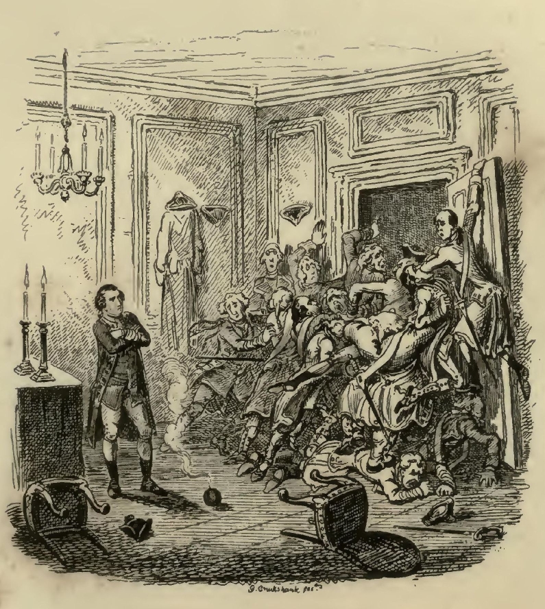 At first they stared upon him for a moment in stupid astonishment, but their eyes soon fell upon the fusé of the grenade, which was fast burning down. Away scampered Colonel, General, Ensign, and Captain, and all made a rush at the door. "Devil take the hindmost." Some fell, and others made way over the bodies of their comrades; some succeeded in getting out, but for an instant there was a general heap of flesh sprawling at the entrance of the apartment. Here was a colonel jostling with a subaltern, and there fat generals pressing lean lieutenants into the boards, and blustering majors, and squeaking ensigns wrestling for exit; the size of one and the feebleness of the other making their chance of departure pretty equal, until time, which does all things at last, cleared the room and left the noble captain standing over the grenade with his arms folded, and his countenance expressing every kind of scorn and contempt for the train of scrambling red coats, as they toiled and bustled and bored their way out of the door.