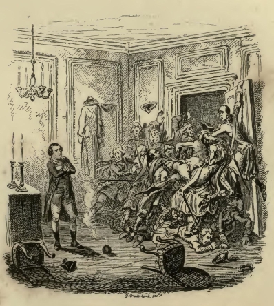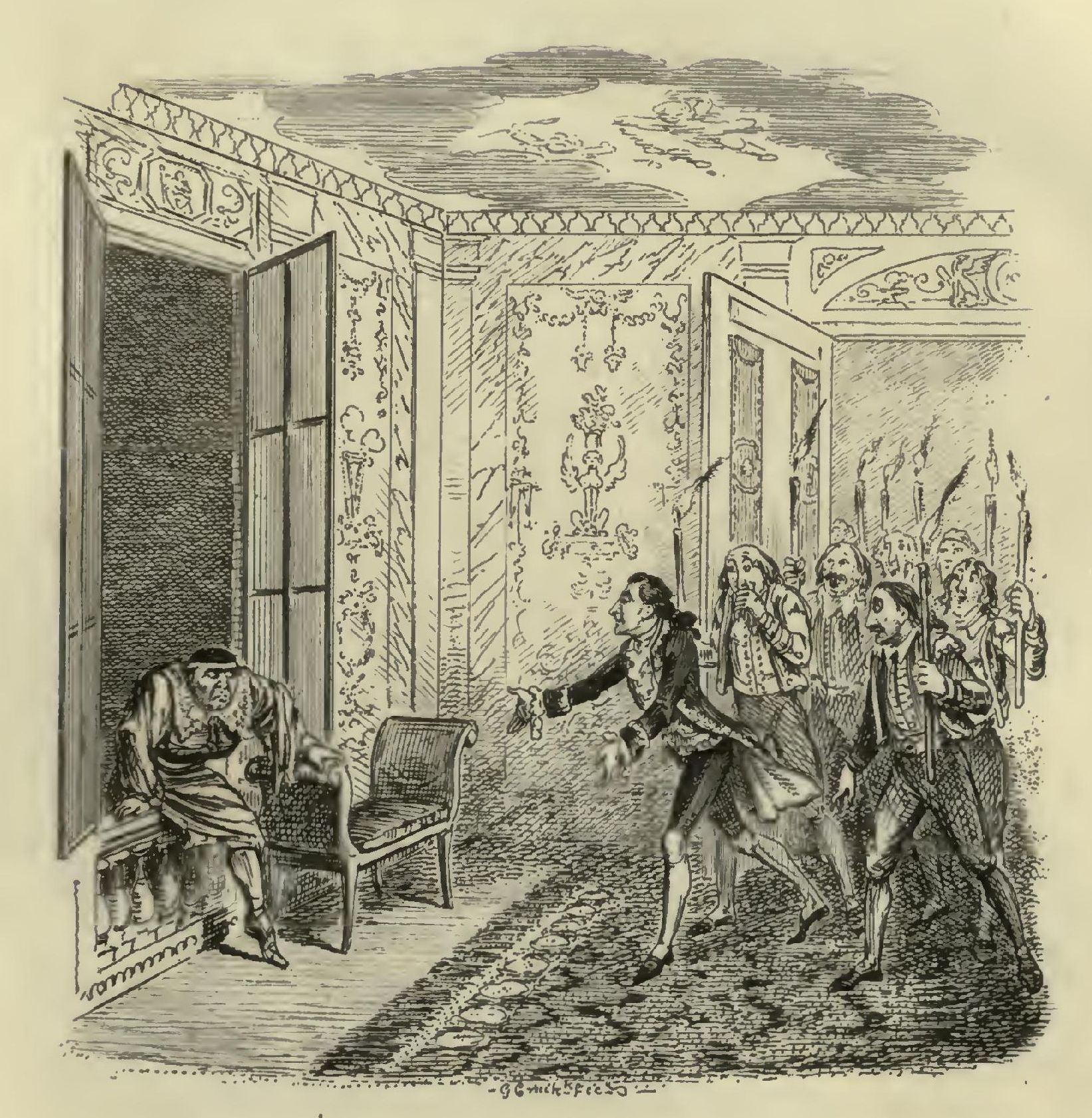 The Prince, at their head, ran up to the window, and with all courtesy helped in the astonished Cardinal, and turning to the servants said, "Scoundrels! is it thus you pay respect to the sacred person of the Cardinal Bernis? Is it thus, by your negligence, that you compel his Eminence, when coming to my wife, to venture his precious life upon a slight ladder and force him through the window in this miserable plight?" Conceive the situation of the bald-pated, cloakless, and tattered Cardinal, as he stood ashamed and terrified before the jeering Prince and his twenty torchbearers. His trembling knees could scarcely support him, as, half dead with fright, shame, and disappointment, he sneaked out of the room, still lighted by the torches and bowed out by the Prince, who continued to apologize for the carelessness of his servants, much to the annoyance of the poor Cardinal, whose misery was heightened by one stroke more; for, as he was huddling off, he just caught the face of the Princess, peeping through the opening of a door with some friends, all almost convulsed with laughter.