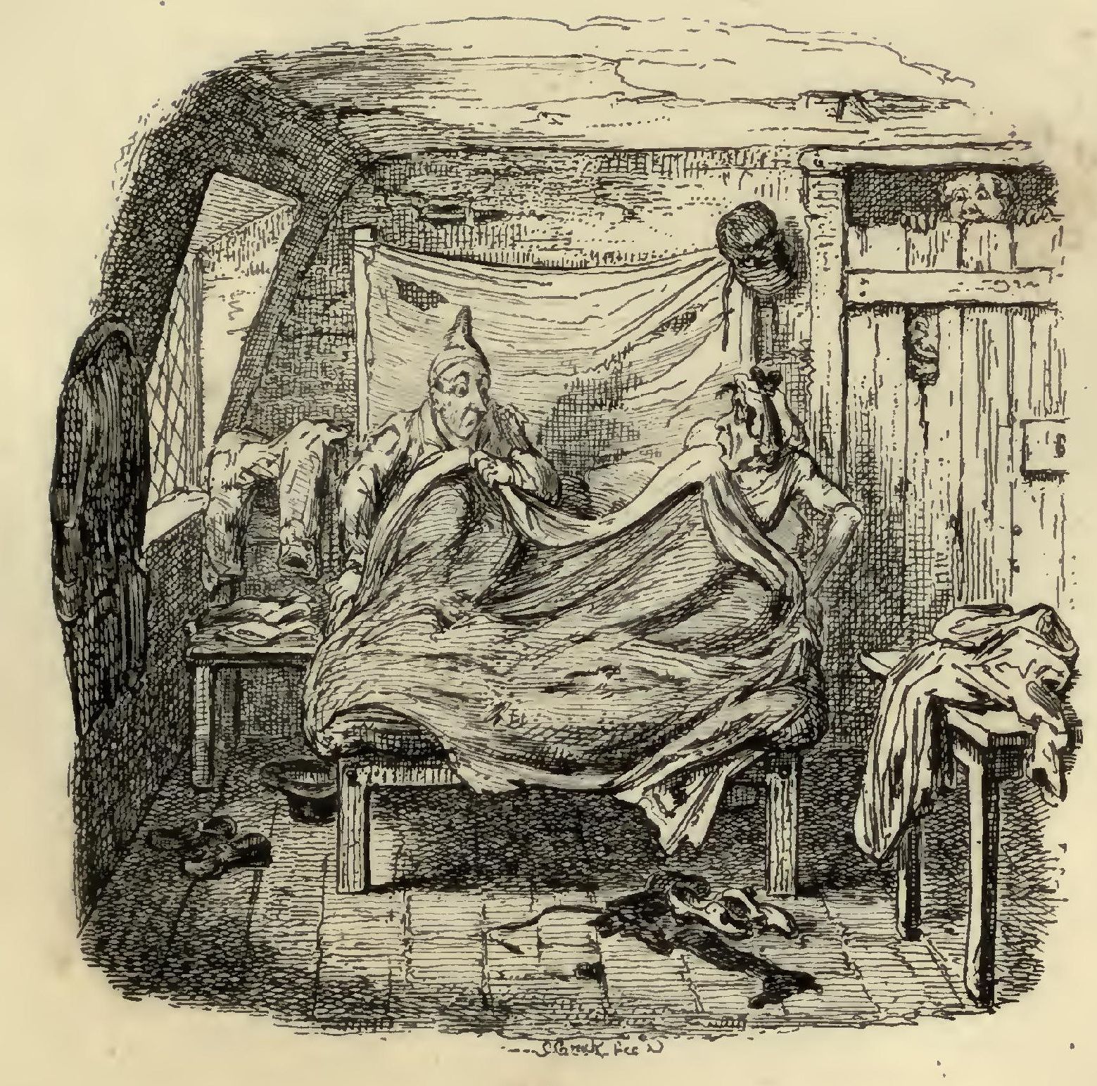 The miller had unexpectedly returned home, and the unfortunate couple within were reduced to despair. The wit of the female was however equal to the emergency; the gentleman's clothes were pushed under her own, and his person was conducted into the kitchen, by the frail fair one, and there enclosed in a singular place of security.