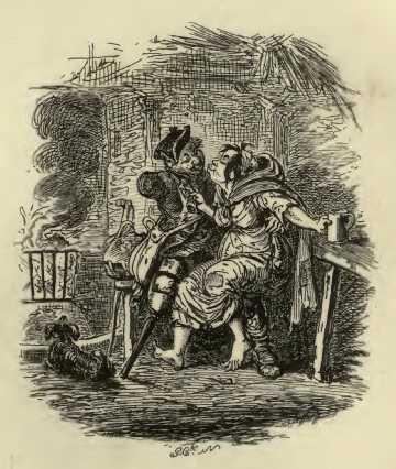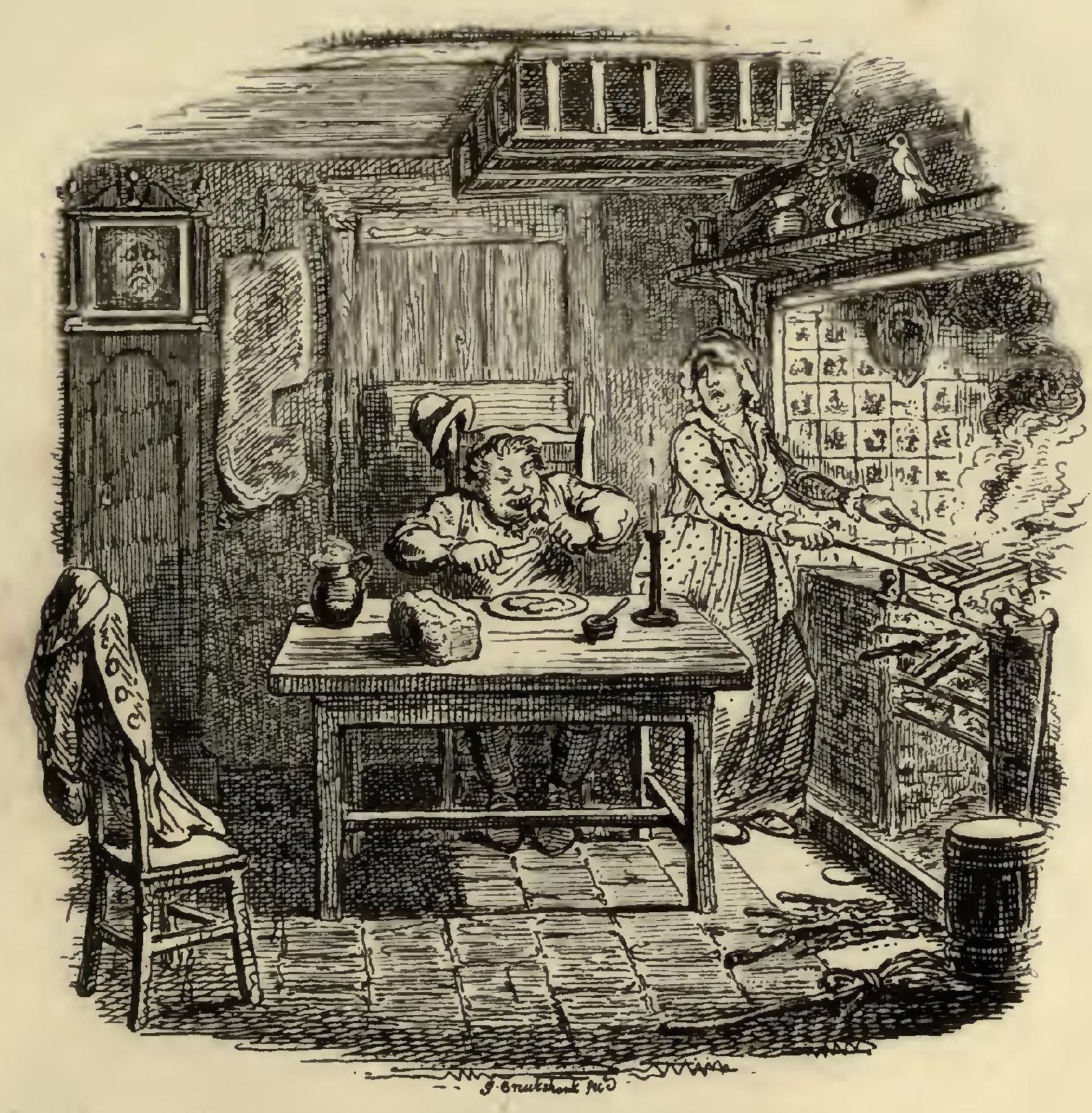 The wife, overjoyed at getting the candle out of the kitchen without discovery, was in high good humour, so that the miller became in excellent spirits too, both on account of his agreeable reception and the dispersion of his fears, and as a proof of his state of mind gave his wife a hearty kiss, and swore that they would go down and have a cozy bit of supper together before they went to bed. In vain the poor woman resisted, the slice of bacon must be broiled and the eggs poached. With trembling hand she bore the light into the kitchen, and durst not cast a glance upon the clock case where the prisoner, full of horror at the return of the candle, and reduced to a state of insufferable impatience by his miserable plight, uttered a deep low groan of despair as they entered the apartment. Fortunately it was not loud enough to attract the miller's attention, but thrilled through the heart of his unfortunate spouse. The happy pair soon began their culinary operations, the male with a light heart and a hungry appetite, the female sick and trembling at the disclosure which she feared was inevitable. All she could do, she did. She tried to keep up a conversation, she shaded the light, and she spread rasher after rasher before the all-devouring miller, who seemed as if intent to display his prowess before his rival, who was most ruefully and intently gazing upon him from his window of observation.