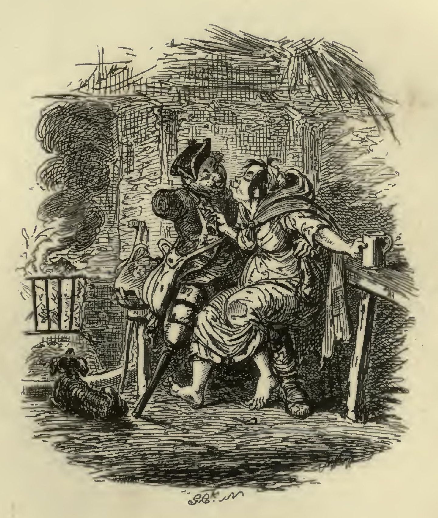 First, neist the fire, in auld red rags, Ane sat, weel brac'd wi' mealy bags, And knapsack a' in order; His doxy lay within his arm, Wi' usquebae an' blankets warm, She blinket on her sodger: An' ay he gies the tozie drab The tither skelpan kiss, While she held up her greedy gab Just like an aumous* dish: Ilk smack still, did crack still, Just like a cadger's** whip; Then staggering, an' swaggering, He roar'd this ditty up—