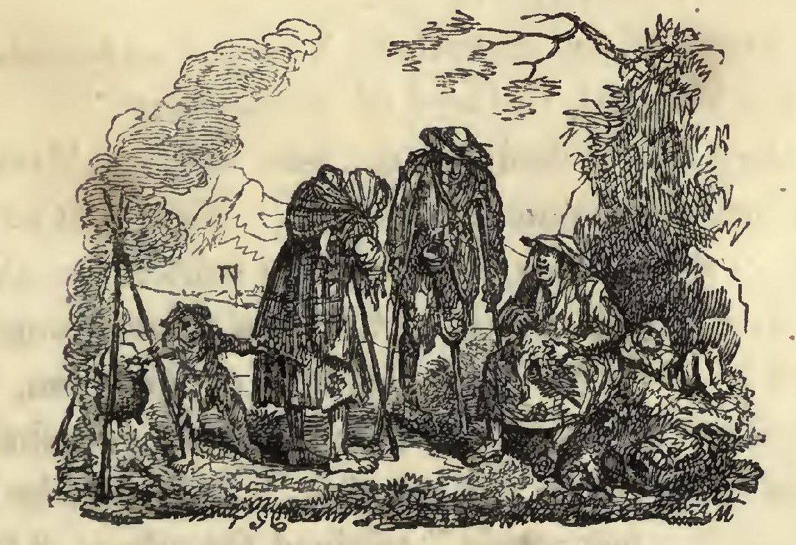 "Yet applauding, as we do most highly applaud, the leading principles of Dr. Currie's selection, we are aware that they sometimes led him into fastidious and over-delicate rejection of the bard's most spirited and happy effusions. A thin octavo, published at Glasgow in 1801, under the title of 'Poems ascribed to Robert Burns, the Ayrshire bard,' furnishes valuable proofs of this assertion; it contains, among a good deal of rubbish, some of his most brilliant poetry. A cantata, in particular, called The Jolly Beggars, for humorous description and nice discrimination of character, is inferior to no poem of the same length in the whole range of English poetry. The scene, indeed, is laid in the very lowest department of low life, the actors being a set of strolling vagrants, met to carouse, and barter their rags and plunder for liquor in a hedge ale-house. Yet even in describing the movements of such a group, the native taste of the poet has never suffered his pen to slide into any thing coarse or disgusting. The extravagant glee and outrageous frolic of the beggars are ridiculously contrasted with their maimed limbs, rags, and crutches—the sordid and squalid circumstances of their appearance are judiciously thrown into the shade. Nor is the art of the poet less conspicuous in the individual figures, than in the general mass. The festive vagrants are distinguished from each other by personal appearance and character, as much as any fortuitous assembly in the higher orders of life. The group, it must be observed, is of Scottish character, and doubtless our northern brethren are more familiar with its varieties than we are; yet the distinctions are too well marked to escape even the southern. The most prominent persons are a maimed soldier and his female companion, a hackneyed follower of the camp, a stroller, late the consort of an highland ketterer, or sturdy beggar—'but weary fa' the waefu' woodie!'—Being now at liberty, she becomes an object of rivalry between a pigmy scraper with his fiddle' and a strolling tinker. The latter, a desperate bandit, like most of his profession, terrifies the musician out of the field, and is preferred by the damsel of course. A wandering ballad-singer, with a brace of doxies, is last introduced upon the stage. Each of these mendicants sings a song in character, and such a collection of humorous lyrics, connected by vivid poetical description, is not perhaps to be paralleled in the English language. The ditty chaunted by the Ballad Singer is certainly far superior to any thing in the Beggar's Opera, where alone we could expect to find its parallel.