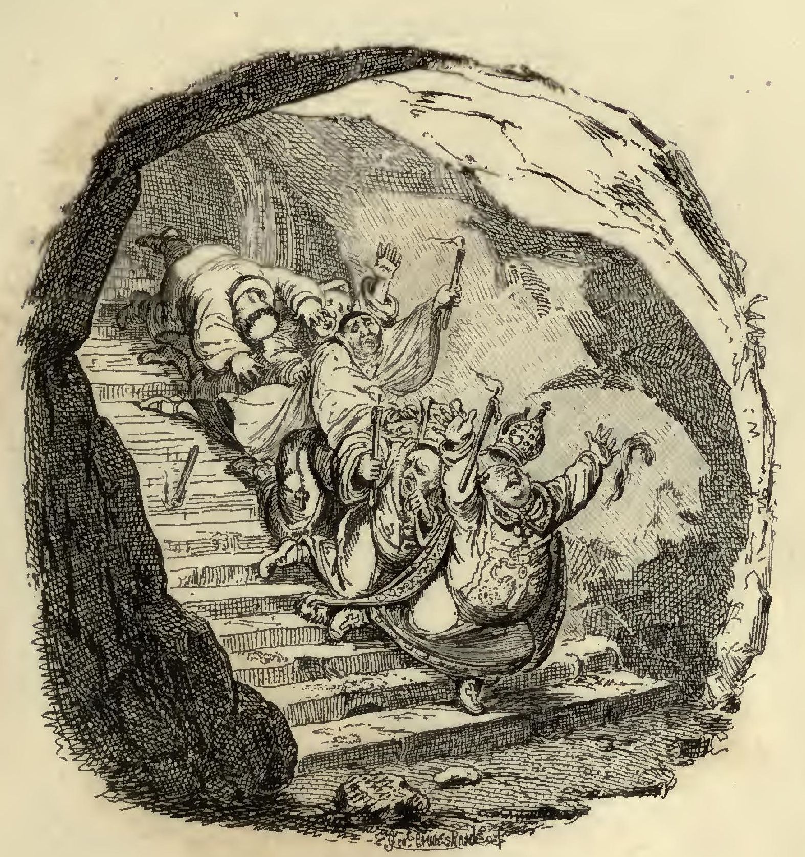 Three times were the consecrated torches borne round by the archbishop, who, muttering between his teeth, dipped the wisp into a large ewer of holy water, and plentifully besprinkled all present; Thus spiritually armed, they silently and cautiously approached the entrance of the cavern. Here a question arose, "who should go down first?" Those who were at home were unwilling to rob the strangers of the honor of precedence. The deans drew back, as being merely subalterns in the church, out of respect to their bishop. The archbishop bowed to the right learned canon, and he bowed to the rest. The General became impatient, and forced the archbishop down the steps. The rest followed with beating hearts and tottering knees.