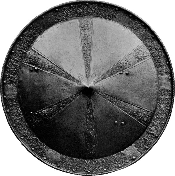 Until the introduction of the Spanish rapier the sword used with the buckler was short and heavy in the blade, though with handles sometimes richly worked and inlaid with silver. The rapier appeared about 1570 to 1580, the slender tapering blade being relatively of great length,[Pg 82] rendering it difficult to sheathe. The guards to the hilts were generally of open work, the variety of form, though endless, falling into three leading groups, the swept-hilted, shell-guard, and cup-hilted, the finest workmanship being as a rule found on the latter. The quillons, generally very long, are either straight or curved. With the rapier, a long dagger held in the left hand and called the main-gauche was used to parry, the blade being notched near the base to entangle and break the opponent’s weapon. Two varieties are figured, both with superbly chased hilts; the one of steel belonging to Mr. Percy Macquoid (Fig. 35), and one with silver guard (Fig. 36), belonging to Her Majesty. The cup-hilted rapier (Fig. 37), reproduced on a slightly smaller scale, is the companion to the latter dagger and is also partly silver-hilted and chased with representations of combats. The quillons are engraved with flowers, and the blade is signed Heinrich Coell, Solingen. The blades and hilts were frequently, perhaps usually, made in different workshops. Many of those in Vienna have German hilts and Italian blades, others have Solingen blades and Milanese hilts. Toledo blades were, however, preferred, and their marks were frequently imitated by German makers. The first ship of the ill-fated Spanish Armada to fall a prey to Drake and Howard was the Capitana of the Andalusian squadron, which among its treasures carried a chest of swords, richly mounted, and intended for presentation to the English Catholic peers. Frequent reference is made in Elizabethan plays to Bilbao and Toledo blades, but more especially to “Foxes,” so called from the Nuremberg mark. Certain passages show that these were used with the buckler, in this country at least; and in the engraving of the funeral of Sir Philip Sidney, targets both round and oval are carried.