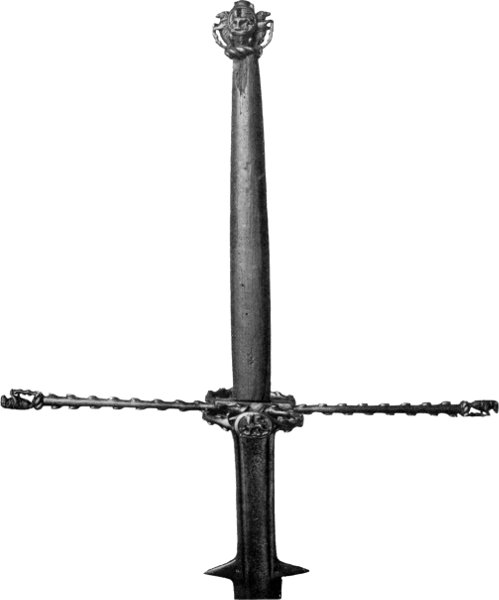 Swords varied considerably in the sixteenth century, the extremes sometimes meeting in the same army, the two-handed sword, scimitar, rapier, sabre, cinquedea, falchion, and malchus, being borne perhaps simultaneously by the mercenary bands comprised in it. The two-handed sword represents the largest dimensions ever attained by this weapon, perhaps originating in the sword of state, like that of Edward III. in Westminster Abbey. It was used in Scotland at an early period; if not wielded by whole clans, certainly by champions of exceptional vigour. Thus Froissart relates that Sir Archibald Douglas fought on foot and wielded an immense sword, the blade of which was two ells long, and so heavy that scarcely any other man could have lifted it from the ground. This great sword is the real claymore, though the name has been misappropriated to the Scottish basket-hilted broadsword of the last century. The Swiss and Germans were the only people who made it an offensive[Pg 78] weapon for large disciplined bodies of troops, and in the sixteenth century it had become an essentially Teutonic weapon. Henry VIII.’s great personal strength and agility enabled him to wield it, as a young man, and to withstand all-comers. The fine hilt illustrated (Fig. 33) from Penshurst, with the pommel and quillons carved and chased out of the solid steel into the bears and ragged staff of the Leicesters, is undoubtedly the most beautiful in the country. The blade has been shortened, perhaps under the edict of Queen Elizabeth, who posted guards at the City Gates to break all swords that were too long.