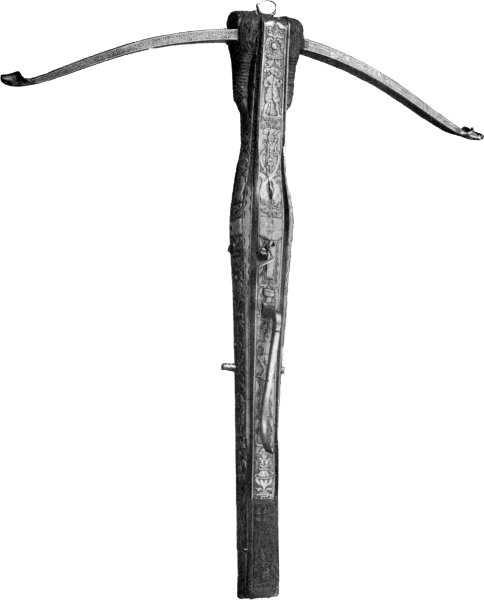 The staves, bills, pikes, morris-pikes, holy-water sprinklers, etc., played a very important part in war at this period. The halberds and partisans carried by officers of the harquebusiers, royal guards, and officials were the vehicles for an immense amount of decoration, especially throughout the seventeenth century. Albert Dürer, writing from Venice to Pirkheimer, mentions that the Italian lansquenets “have roncoins with 218 points, and if they pink a man with any of these, the man is dead, as they are all poisoned.” This could hardly have been serious, but a sheet of drawings by Leonardo da Vinci shows some very extraordinary[Pg 83] forms. Most of the varieties of staves were no doubt originally developments of the peasant scythes, bill-hooks, pitch-forks, and the poll-axe; each country preserving some peculiar form. The cross-bow had long ceased to be a military weapon, but was, owing to its silent fire, still in great repute for sport. It was usually inlaid with ivory, engraved, sometimes stained and heightened with pearl. A fine specimen in the Tower is illustrated (Fig. 38).