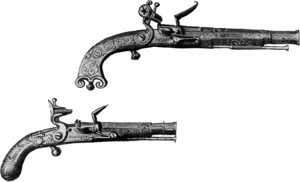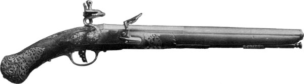 These weapons were remarkable for grace of outline and great lightness. The butt has a small knob, which, when unscrewed, forms a picker to clear the touch-hole with. The mainsprings in many cases appear to be weak, having little room to work in the slender stocks.