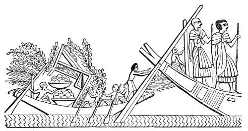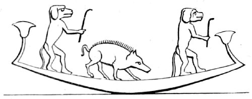 The representation of this return of a condemned soul under the repulsive form of a pig, is painted on the left side wall of the long entrance-gallery to the tomb of King Rameses V., in the valley of royal catacombs known as the Biban-el-Molook, at Thebes. Wilkinson gives the date of the accession of this monarch to the throne as 1185 B.C. In the original picture, Osiris is seated on his throne at some distance from the stern of the boat, and is dismissing it from his presence by a wave of the hand. This tomb was open in the time of the Romans, and termed by them the “Tomb of Memnon;” it was greatly admired, and is covered with laudatory inscriptions by Greek and Roman visitors. One of the most interesting is placed beneath this picture, recording the name of a daduchus, or torch-bearer in the Eleusinian mysteries, who visited this tomb in the reign of Constantine.