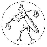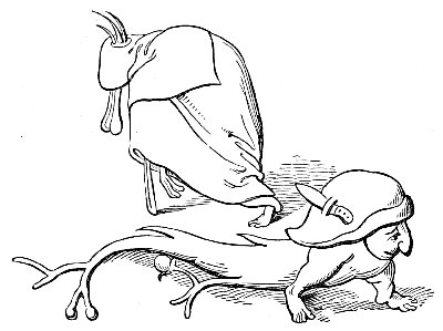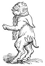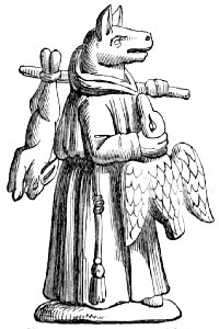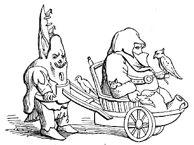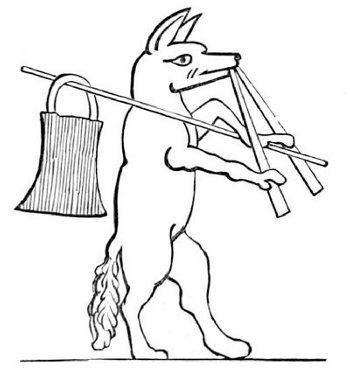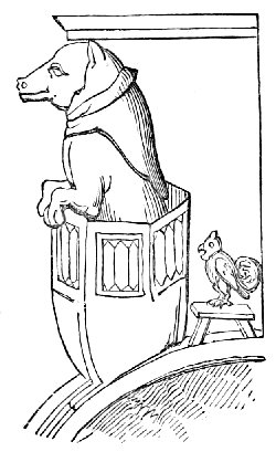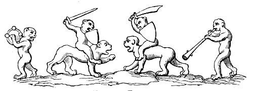 Another cut (No. 3), taken from one of the same series of paintings, belongs to a class of caricatures which dates from a very remote period. One of the most natural ideas among all people would be to compare men with the animals whose particular qualities they possessed. Thus, one might be as bold as a lion, another as faithful as a dog, or as cunning as a fox, or as swinish as a hog. The name of the animal would thus often be given as a nickname to the man, and in the sequel he would be represented pictorially under the form of the animal. It was partly out of this kind of caricature, no doubt, that the singular class of apologues which have been since distinguished by the name of fables arose. Connected with it was the belief in the metempsychosis, or transmission of the soul into the bodies of animals after death, which formed a part of several of the primitive religions. The earliest examples of this class of caricature of mankind are found on the Egyptian monuments, as in the instance just referred to, which represents “a soul condemned to return to earth under the form of a pig, having been weighed in the scales before Osiris and been found wanting. Being placed in a boat, and accompanied by two monkeys, it is dismissed the sacred precinct.” The latter animals, it may be remarked, as they are here represented, are the cynocephali, or dog-headed monkeys (the simia inuus), which were sacred animals among the Egyptians, and the peculiar characteristic of which—the dog-shaped head—is, as usual, exaggerated by the artist.