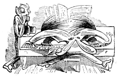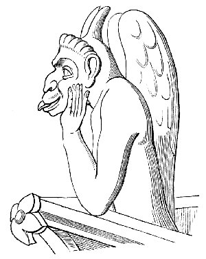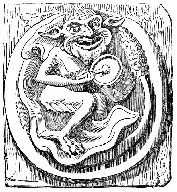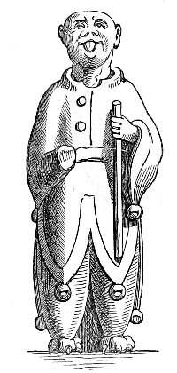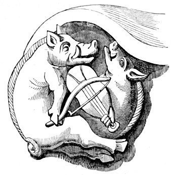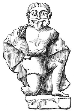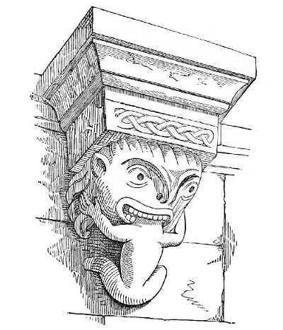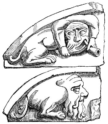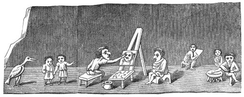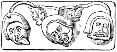 A tendency to burlesque and caricature appears, indeed, to be a feeling deeply implanted in human nature, and it is one of the earliest talents displayed by people in a rude state of society. An appreciation of, and sensitiveness to, ridicule, and a love of that which is humorous, are found even among savages, and enter largely into their relations with their fellow men. When, before people cultivated either literature or art, the chieftain sat in his rude hall surrounded by his warriors, they amused themselves by turning their enemies and opponents into mockery, by laughing at their weaknesses, joking on their defects, whether physical or mental, and giving them nicknames in accordance therewith,—in fact, caricaturing them in words, or by telling stories which were calculated to excite laughter. When the agricultural slaves (for the tillers of the land were then slaves) were indulged with a day of relief from their labours, they spent it in unrestrained mirth. And when these same people began to erect permanent buildings, and to ornament them, the favourite subjects of their ornamentation were such as presented ludicrous ideas. The warrior, too, who caricatured his enemy in his speeches over the festive board, soon sought to give a more permanent form to his ridicule, which he endeavoured to do by rude delineations on the bare rock, or on any other convenient surface which presented itself to his hand. Thus originated caricature and the grotesque in art. In fact, art itself, in its earliest forms, is caricature; for it is only by that exaggeration of features which belongs to caricature, that unskilful draughtsmen could make themselves understood.