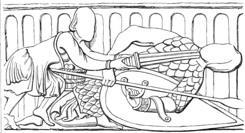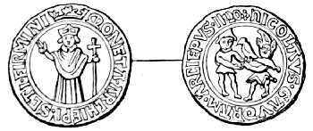 [68] The words of this charter, as given by Rigollot, are:—“Joannes, D G., etc. Sciatis nos dedisse et præsenti charta confirmasse Willelmo Picol, follo nostro, Fontem Ossanæ, cum omnibus pertinenciis suis, habendum et tenendum sibi et hæredibus suis, faciendo inde nobis annuatim servitium unius folli quoad vixerit; et post ejus decessum hæredes sui eam tenebunt, et per servitium unius paris calcarium deauratorum nobis annuatim reddendo. Quare volumus et firmiter præcipimus quod prædictius Piculphus et hæredes sui habeant et teneant in perpetuum, bene et in pace, libere et quiete, prædictam terram.”—Rigollot, Monnaies inconnues des Evêques des Innocens, etc., 8vo., Paris, 1837.