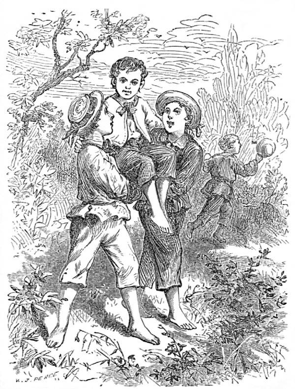 Joe and Willie made a chair of their crossed hands, on which Frankie seated himself, and put an arm around each of the boys’ necks. This mode of traveling pleased him very much, and it seemed but a little while before they reached the creek.