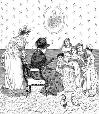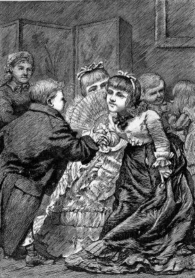 Wonderful to tell, they had wearied of all the pretty new toys, and found an end to play. After tea they sat quietly in the fire-glow, talking with mamma about the beautiful new picture that was her gift to them. It was a charming group of gayly dressed children—little Princes and a Princess, the children of the unhappy King Charles I. of England. The tallest was a handsome boy, in a suit of scarlet velvet, with a broad collar of rich old lace. He held by the hand a tiny tot, in a frilled cap and a dress of blue silk, who timidly clung to the protecting arm of his big brother. The third was a quaint little damsel in a robe of creamy satin, standing with her dainty hands demurely folded before her. Her long stately dress touched the floor with its border of Vandyck points, and her small head was curiously dressed in a by-gone courtly fashion. About her pretty throat was a necklace of costly pearls, and she looked the perfect model of a tiny old-time lady of high degree. A pair of graceful spaniels crouched at the feet of the children, and behind them was a curtain of some rich foreign stuff. The fire-light flashed on the sweet young faces and shining auburn hair, touching the waves and curls, while the shadows danced and nickered until it seemed to Allan that the bright eyes smiled back to him as he looked up. It was like a pleasant dream, and Allan's blue eyes grew slowly dim and dimmer. Jessie's eyelids had been drooping from the time mamma began to tell about the royal children, and directly the twins were fast asleep. Papa came in, and mamma laughed with him at the effect of her story, and then the little sleepers were playfully shaken until they were wide awake enough to walk up stairs.