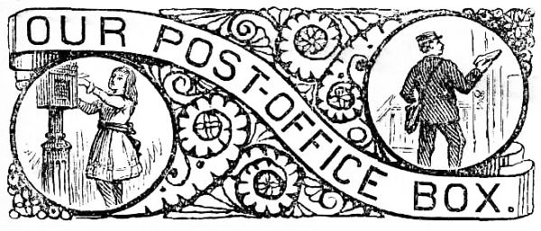 Henry A. Blakesley, Harry F. Haines, E. A. De Lima, and many Others.—We are sorry not to print your requests for exchange, but that department of our Post-office Box is so very crowded that we can not give space to addresses which have been already[Pg 143] published, unless the exchange offered is of some new article. Neither can we attend to irregularities between exchanges, which arise in almost every instance from carelessness, or failure to give a proper address. We know of no remedy for those who fail to receive answers to their letters except to continue sending reminders to the delinquent correspondent. A great many boys and girls write to us that they receive so many letters, they can not answer them all promptly, as they are going to school, and very busy with studies, but that they will surely answer them in time. We hope they will not forget this promise, as a letter should always be acknowledged.