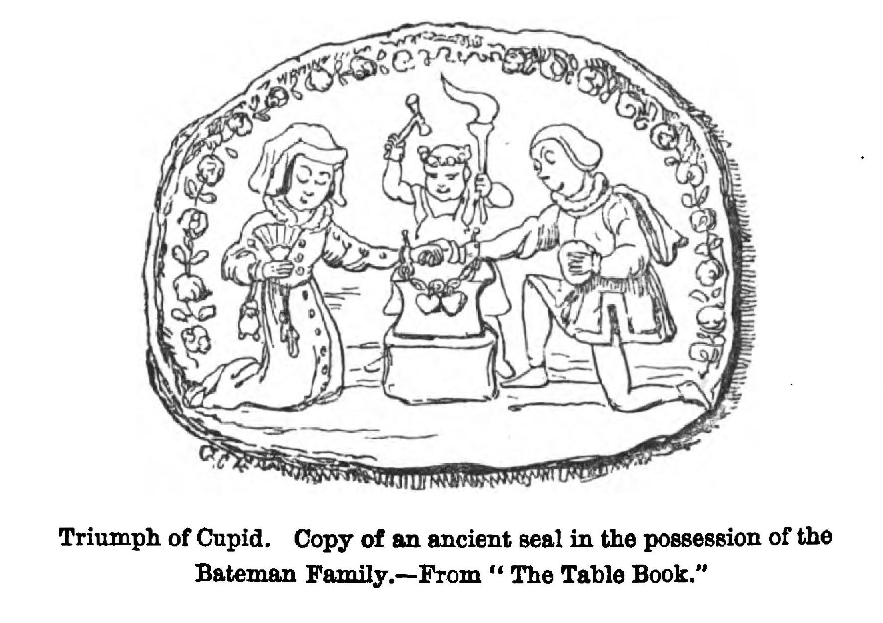 Cupid perches himself upon his foot, and toasts a heart at the fire; jumps upon the back of Old Time who bears the clock upon the mantelpiece; is enthroned in a triumphal car, with kings and princes, bishops and generals, lawyers and stock-jobbers, drummer-boys and jack-tars and sweeps, clown and harlequin, and even slippered pantaloon, and Chelsea pensioners upon wooden stumps, for his court. The car is drawn by subdued lions and leopards.