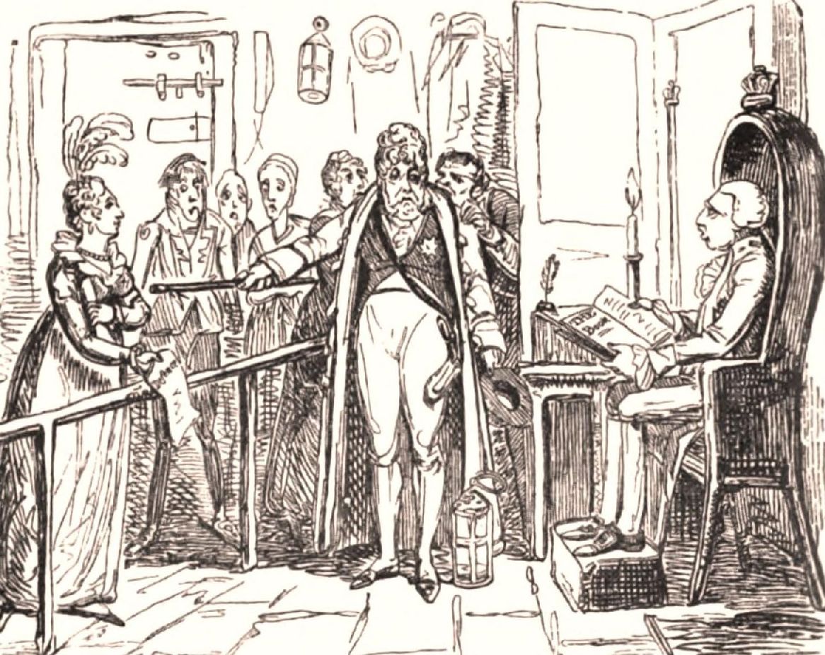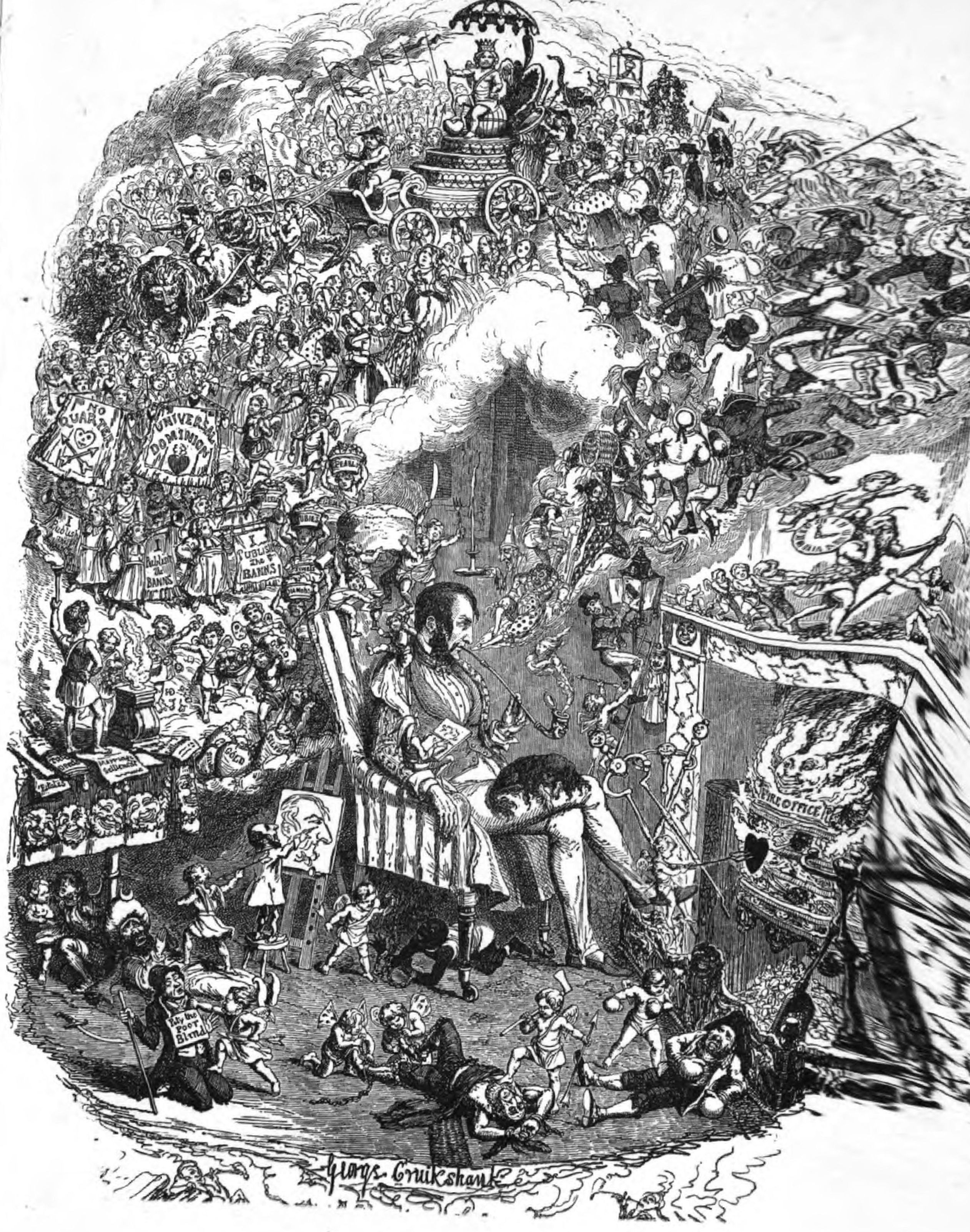Of George Cruikshank the history is short. He stands too often and too well before the eyes of the public to render it necessary that we should say much about him; and we confess that of his earlier annals we know little or nothing.... The first of Cruikshank’s works known to us are his caricatures of George IV. and his friends. Tories as we were and are, and as we trust we still shall be, these comic picturings haunt our imagination. The poor old king in every attitude of ludicrous distress (the ‘Fat in the Fire’ was perfection); Copley (sketched, as we have been assured, merely from description, and yet a great likeness); Castlereagh (but even the professed caricaturist could not destroy the gentlemanly grace of that noble face and figure); the ‘Waterloo man,’ with his sword dropping into the scale against the pen; the various persons, jailors, jockeys, lawyers, and the rest, were first-rate. As Cruikshank himself says of Gillray, ‘He that did those things was a great man, sir,—a very great man, sir.’ To Cruikshank, however, they were productive of nothing but the fame of their cleverness and the odium of their politics; as Hone, for whom and his blockhead authors George’s talents floated the dire rubbish of the ‘House that Jack Built,’ and other witless productions, never paid him for what he had done. In all these stupid productions there were loud puffs at the power of the press. George never knew anything of it when in their hands but as a screw.* However, what he did, gave him fame and name.... Of course, George is, like all other men of undoubted genius, a most ill-used gentleman. As Mathews laments that the general obtuseness of the public will not recognise his talents for tragedy,—as Liston mourns over the delusion which applauds him in Sam Swipes and Paul Pry, and does not permit him to appear as the Damon or Strephon of a sighing opera,—so Cruikshank is shocked at the evil fate which consigns him to drawing sketches and caricatures, instead of letting him loose in his natural domain of epic or historical picture.