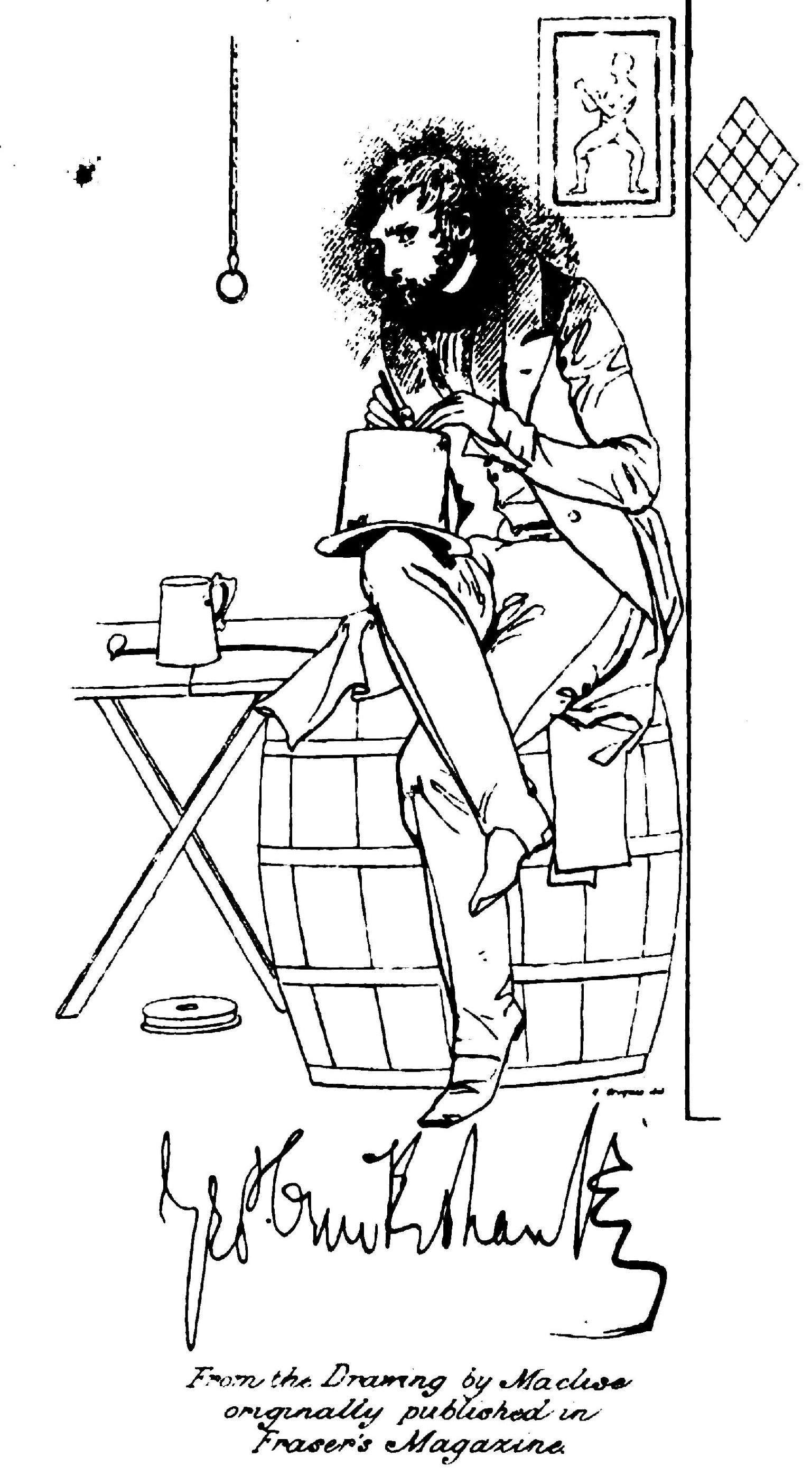 I will now endeavour to afford the reader an idea of the man who created the extraordinary variety of artistic work of high excellence briefly described in the foregoing chapters. George Cruikshank was eminently a convivial man. He was born in a boisterous and coarse convivial time; when Lords and Commons boxed at Jackson’s; went to see monkeys set to fight terriers at Cribb’s; fought “Charleys” and turnpike-men; and drank hard and played high at Crockford’s. Their humble imitators were the associates of Robert and George Cruikshank. George’s associates were tavern frequenters for the most part: in those days taverns were used by many of the men who now frequent clubs. The portrait of him drawn by Maclise was Cruikshank in his earlier and humbler time, when he was in the hands of the caricature vendors. The writer in Fraser says: “Here we have the sketcher sketched; and, as is fit, he is sketched sketching. Here is George Cruikshank (see Frontispiece)—the George Cruikshank—seated upon the head of a barrel, catching inspiration from the scenes presented to him in a pot-house, and consigning the ideas of the moment to immortality on the crown of his hat....