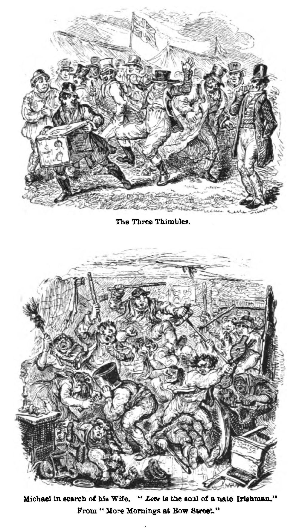 The fun of Mr. Rigdum Funnidos was of a kind that has found many imitators. In the “proceedings of learned societies” we find that the fossil remains of an antediluvian pawnbroker had been dug up within a mile of Hog’s Norton; that a successful method of converting stones into bread has been transmitted to the New Poor Law Commissioners, and a three-and-sixpenny medal presented to the ingenious discoverer thereof; then that a laborious investigator has reckoned that there are exactly nine millions, one hundred and sixty-four thousand, five hundred and thirty-three hairs on a tom-cat’s tail, which he defies all the zoologists of Europe to disprove. Later on (1839) Thackeray contributed “Stubbs’ Diary” and “Barber Cox, or the Cutting of his Comb,” to the pages of Funnidos. From the first, Cruikshank hit hard at quacks and shams. The first almanac has an “advertisement extraordinary” of the “British Humbug College of Health,” and some amusing testimonials from Gudgeon and Gosling, who have been cured by “Morising Pills.” The moral at the close of the almanac is, “While we venerate what is deserving of veneration, let us not forget that quackery, knavery, bigotry, and superstition always merit exposure and castigation.”