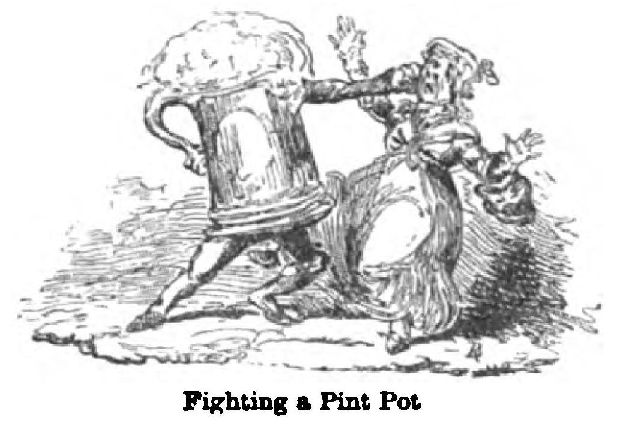 In the Almanac which included the Guy Fawkes cartoon appeared Cruikshank’s Father Mathew, a nice man for a small party. Father Mathew appears in the shape of a pump or filter to a convivial domestic circle, and holds parley with them. The animated pump, with the extended handle for a warning arm, and the spout for a nose, is an old Cruikshankian figure. “Touch not—taste not,” says the preacher-pump: “if you must take anything, take the Pledge.”