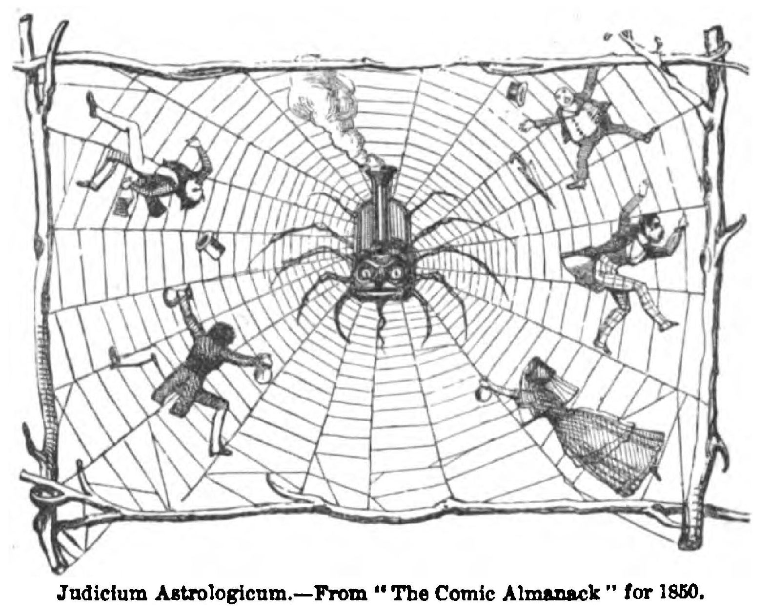 In 1835 the late Mr. Tilt, publisher, of Fleet Street, started the Comic Almanac, and engaged George Cruikshank to illustrate it. It was a happy idea, exactly suited to the more popular side of the mood and genius of the artist; and Cruikshank entered upon his task with zest For nineteen years this annual comic and satirical commentary on passing and probable events, not only furnished him with a regular income, giving him work on which he might reckon with certainty in estimating his very fluctuating resources; but it afforded him the opportunity, in which he always delighted, of recording in his own quaint, original manner, his opinions on the questions of the day.