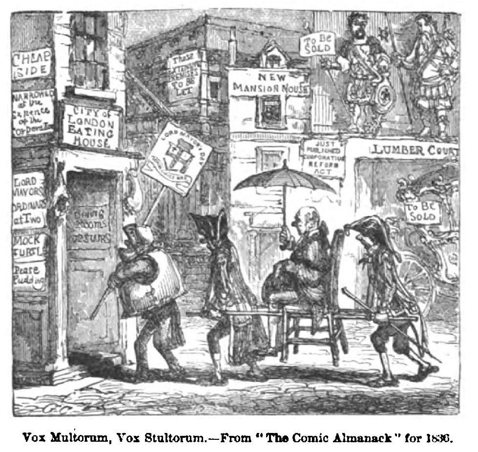 In 1835, when the first almanac appeared, the water cure was amusing the public. Cruikshank’s first plate shows one enthusiast under the water-butt, another under a burst water-pipe, and a third in an elegant attitude, being pumped upon by his servant, and remarking, “Well, I could not have supposed that being ‘pumped upon’ was such a luxury! and so invigorating! And to think that so good a thing should hitherto have been thrown away upon qui tam attorneys, sprained ankles, and pickpockets!” Then Mr. Rigdum Funnidos (originated by the late Mr. Vizetelly, I am informed by his son Henry), enters upon the scene, and continues year after year to be the nom de plume of a succession of wits and humourists; and Cruikshank unfolds his series of plates of the months, each season being indicated by some humorous incident or some happy notes of observation of our London streets. The ice-carts and slides of January; the muddy streets and bustling postmen of St. Valentine’s day,—how unlike (with their great leather bags) the postmen of our day! the winds of March outside Mr. Tilt’s shop, blowing even a dog’s tail over his back; showery April, with a wonderful group of Cockneys standing up; the sweeps of Mayday; June, at the Royal Academy—a bit of Cruikshank at his brightest; July, in Vauxhall Gardens, with the band in cocked hats, and the famous master of the ceremonies in pumps; Cruikshank’s old friend, the dustman, eating his first oyster in August; Greenwich Fair in September; going into the country by the stage coaches in October; Guy Fawkes in November; and the Christmas pudding, with a laughing company welcoming it, in December. As pictures of the humorous side of London life upwards of forty years ago, these spirited etchings, which teem with life, are invaluable.