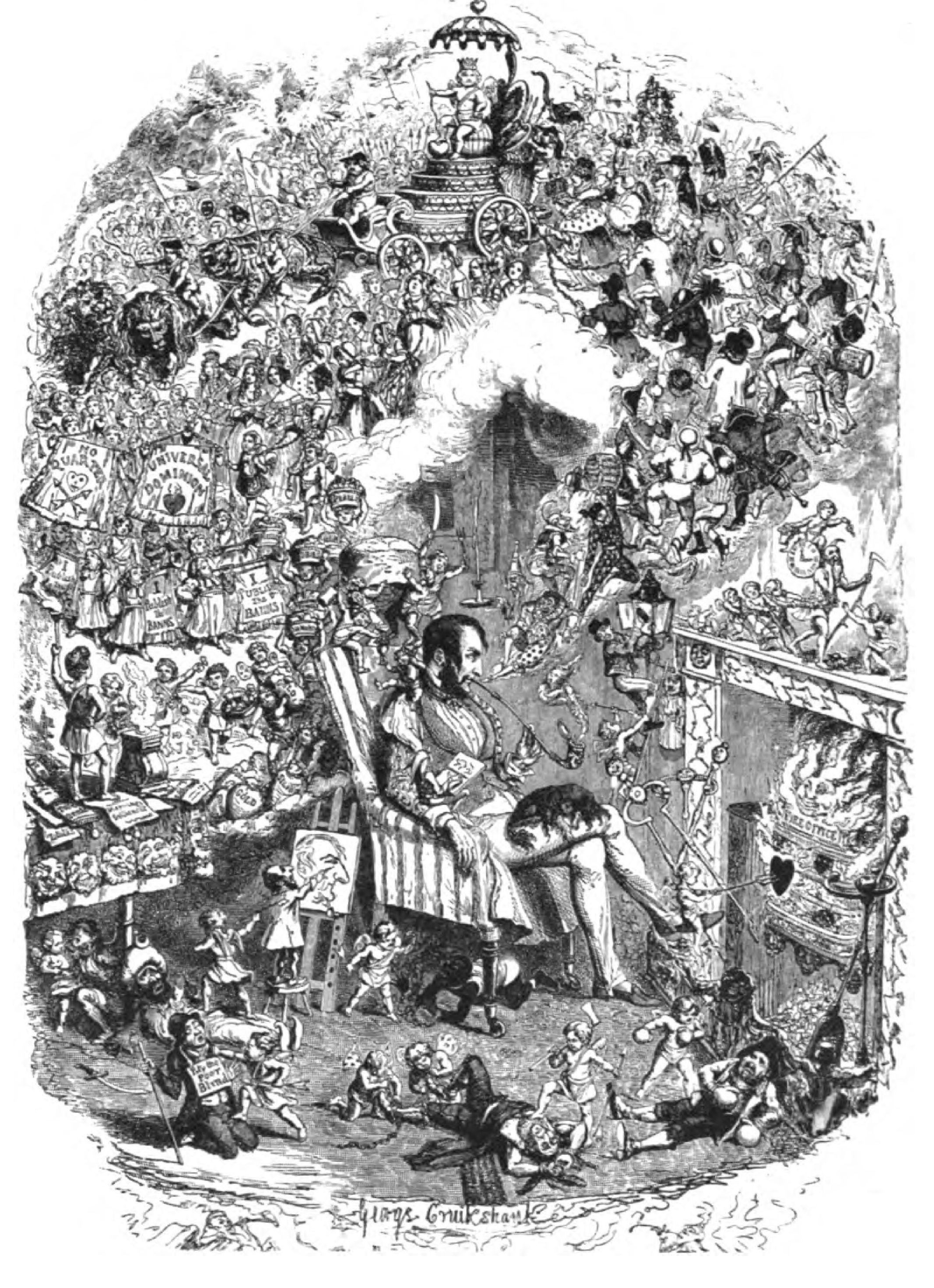 “Cruikshank spoke most gravely on this ‘hideous, abominable, and most dangerous custom,’ an evil that he was determined to try to put down, and for this end he had prepared the designs that he showed to me, and which had been already engraved. These illustrations he wished me to work into letterpress, which should first appear in the projected magazine, and should then be reprinted in the form of a small pamphlet. He did not desire to make money by the publication of this pamphlet; on the contrary, he intended to have many thousand copies printed at his own expense, and to employ men to distribute them gratuitously to the public. There were to be men posted outside every railway station in London, and as each cab or carriage rolled from under the gateway, one of the pamphlets was to be tossed into the vehicle. The omnibus travellers were to be liberally dealt with in the same way, and by these means Cruikshank was quite sanguine that the reform which he so much desired would be effected in generation.