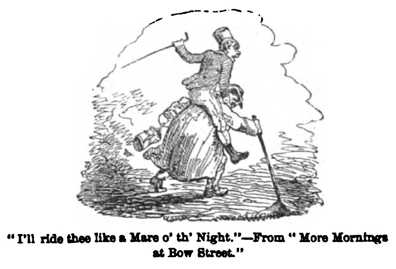“I remember him about 1846,” said Mr. W. H. Wills, another old friend. “He was then flirting with Temperance. I wanted him to dine at my house; but he excused himself, saying he should be led into temptation, and he had resolved to be a water-drinker thenceforth.” He did not go to dinner, but dropped in later—much excited; and when his host pushed the water-bottle towards him, he gently added brandy. The guests departed, leaving the hilarious George, with two others, to finish the evening; and when the trio got into the street, they found the old difficulty in restraining Cruikshank’s boisterous spirits. After trying in vain for something more than an hour to lead him home, they left him—climbing up a lamp-post!