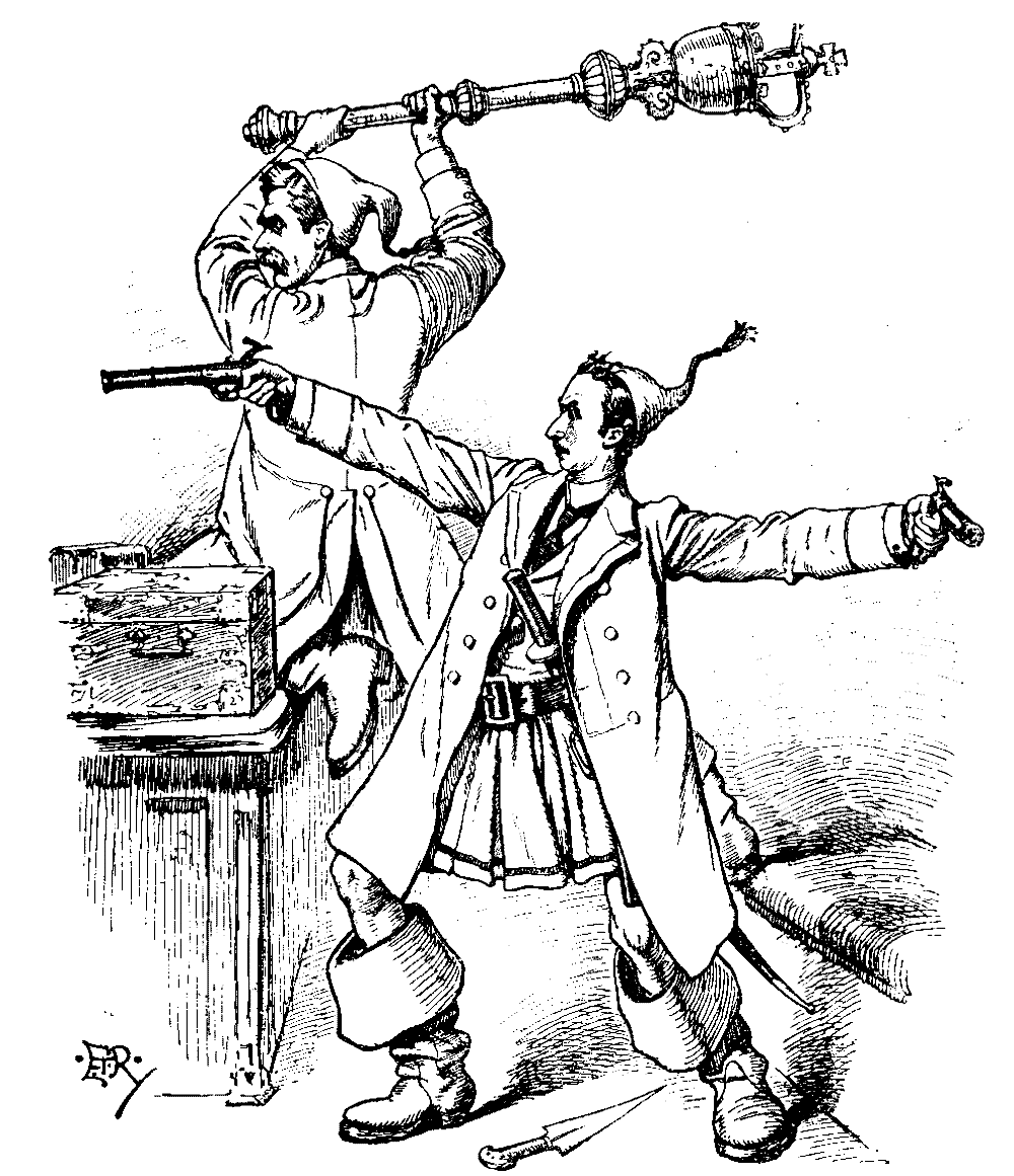 An anxious moment. George Curzon tugged nervously at the arsenal scarcely concealed under his frock coat. St. John Brodrick involuntarily stretched forth his hand in direction of Mace. Suppose he were to seize it, sweep the Treasury Bench clear at a blow, whilst George Curzon, with pistol in either hand, and dagger between his teeth, let fly a volley or two? We might have had a revolution. Quieter counsels prevailed. Speaker directed Pirate Peer to withdraw below Bar whilst his case was being discussed.