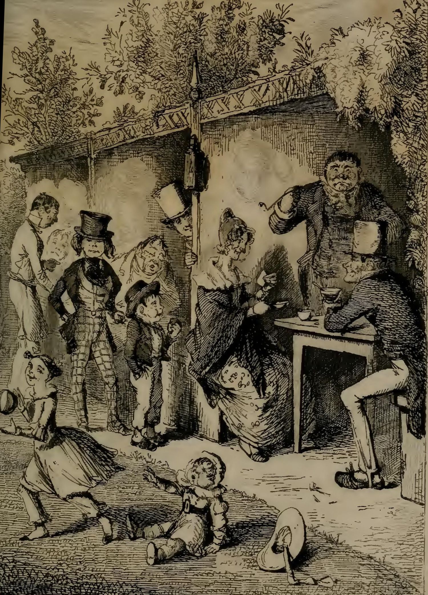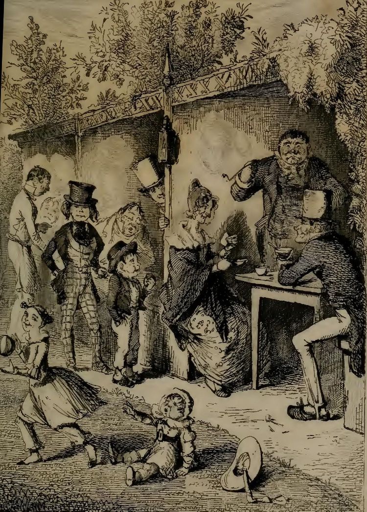 In this, and innumerable similar places about the environs of the metropolis, it is that, on fine warm summer afternoons and evenings, especially on Sundays, the shop-tired and counter-sunk inhabitants of the respectable working classes assemble, ostensibly for the purpose of imbibing what by common courtesy is dignified with the title of fresh air, though in reality with equally as settled an intention of mixing the said fresh air with bottled stout, three X ales, and a pipe or two of bird's-eye. Here you may see the young lover anxiously endeavouring to “insinivate” himself into the good graces of his sweetheart, by evincing the most striking solicitude that she should soak up repeated bird-sips of his cold “blue-ruin.” You may observe them—true lovers of twilight—getting into the veriest back corner of arbour or bower, telling in security the almost silent tale, that no ear may hear but theirs. Here, also, is seen the young husband, with his wife following behind him, a “pledge” of affection toddling by his side, and perhaps a “duplicate” hugged preciously up in his arms; while the empty-headed spark, who lives in seeing and being seen, the gross and sensual guzzler of heavy wet, and the old quiet smoker, whom nothing can move or elevate, make up this motley assembly. Pots and glasses appear on every side, and busy waiters running in all directions across the grass, with tray, or lantern, or glowing piece of live touchwood, to light the pipes of the company.
