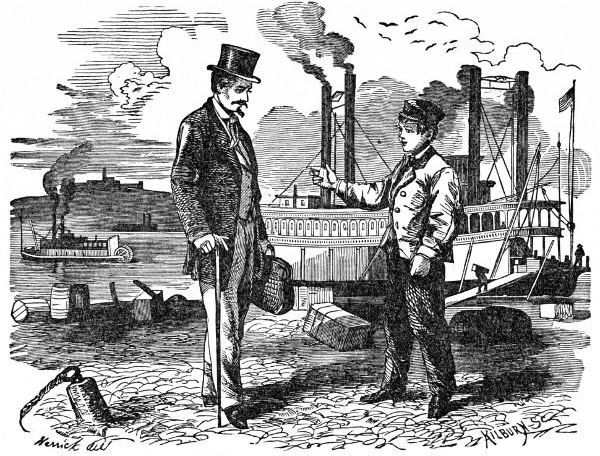 Our conversation was interrupted by the stopping of the steamer at a wood-yard; for I never lost an opportunity, on those occasions, to take a walk on shore. I was nervously anxious to see everything there was to be seen. All was new and strange; and every day, as the settlements on the banks of the great river increased in number and extent, afforded me a new sensation. As I had been brought up far away from the haunts of civilization, even a house was a curiosity to me; and I gazed with [14]astonishment at the busy scenes which were presented to me in some of the larger towns. At St. Joseph we had taken on board quite a number of passengers, and the scene in the cabin had become much livelier than before.