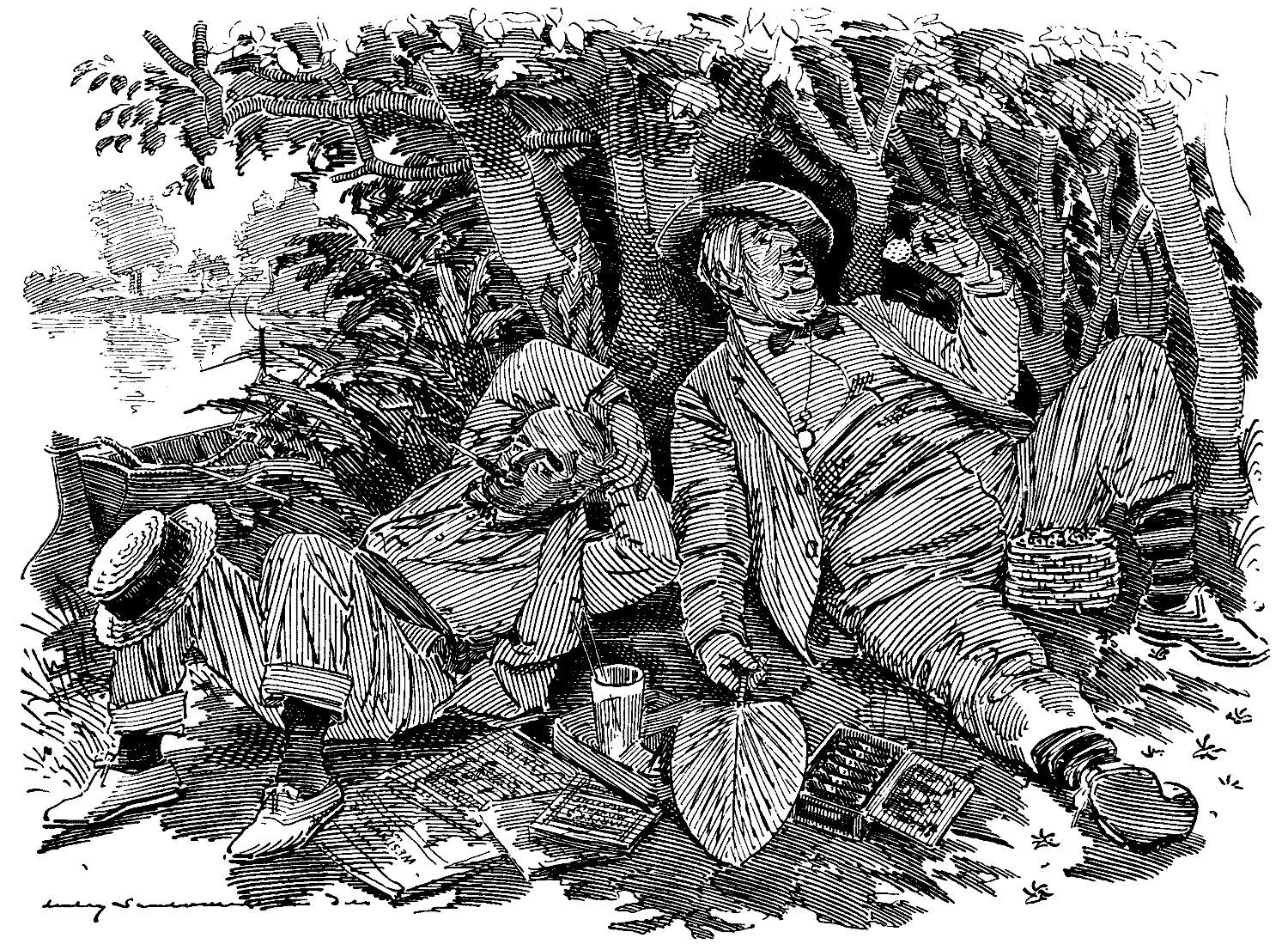 Thursday. June 27, Mid-day. The Baron opens ventilators, doors, windows. Then, at haphazard, he takes up a book. Its title, What is heat?... Answer immediately given by thermometer, "95° in the shade." That's heat! And if that isn't, what is? The second title of book is, A Peep into Nature's Most Hidden Secrets. But the Baron is not Paul Pry; he doesn't want to peep; at all events he cannot undertake any exertion until about November, say, when he will be delighted to peruse the work of Mr. Frederick Hovenden, F.L.S., F.G.S., F.R.M.S.,—"Three single Fellows rolled into one." "Let me descend to the ice-cellar, or in cool grot let me sit, with a soothing iced beverage and a choice Havannah; let me read there About the North Pole, and Gunter's Tales of Ices," quoth the