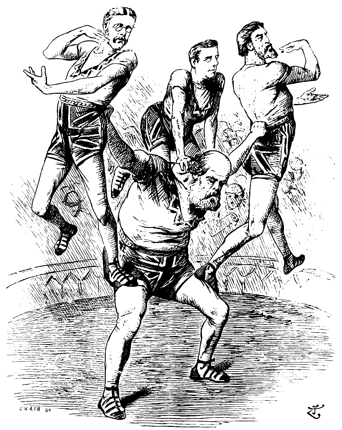 House crowded from furthest bench of side galleries to gangway steps on floor. A buzz of excitement completes fulness of chamber. Only two empty seats. These on front benches, where Squire of Malwood and Prince Arthur were wont to face each other. Joseph's seat below gangway filled by Courtney, who, in honour of occasion, has put on a white waistcoat and a smile. Wears both throughout proceedings. A loud cheer welcomes arrival of Prince Arthur looking graver than usual. Three minutes later another rings forth, and the Squire of Malwood enters with slow step and countenance set, suitable to the obsequies of an assassinated Ministry. Jesse Collings comes in; startled by cheer from Irish Members.