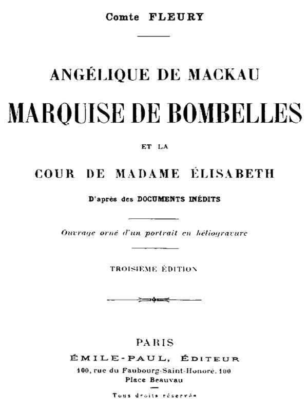 Aucun des écrivains ayant eu à retracer la vie de Madame Élisabeth n'a négligé de prononcer le nom de la marquise de Bombelles, née Angélique de Mackau. On sait qu'avec la marquise de Raigecourt, née Causans, et la vicomtesse des Monstiers Mérinville, née La Briffe, elle fut l'amie de cœur de la sœur de Louis XVI, et les nombreuses lettres si affectueusement incorrectes que lui a adressées Madame Élisabeth ont sauvé son nom de l'oubli [4]. Par malheur les renseignements que nous 2 ont transmis Ferrand dans son Éloge de Madame Élisabeth (1795), Feuillet de Conches dans son Introduction aux Lettres de Madame Élisabeth, et l'éditeur des Mémoires de la baronne d'Oberkirch sont erronés sur bien des points.