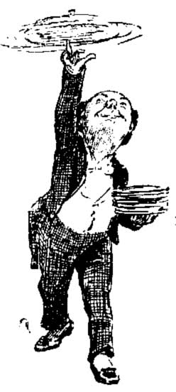 In spite, however, of the unrivalled attractions of Calais, I determine to go no further than the buffet. Acting under the instructions of Mr. Recorder Bunny, Q.C., who seems to know the ropes thoroughly well, I allow the "goers on" (passengers bound for Paris and the Continent generally) to satisfy their cravings for food, and then give my orders. A waiter, who has all the activity of his class, representing, let us say, the best traditions of the Champs Elysée, takes me in hand. We make out a menu on the spot—Melon, tête de veau à la vinaigrette, caneton aux petits pois, and a cheese omelette. Then half a bottle of red wine, a demi-syphon, and a café and chasse. All good. Then the garçon skips away, placing knives and forks at this table, a dish of fruit at that, and a basket of bread at the one yonder. These athletic exercises (that are sufficiently encouraging to promise the performer—if he wishes it—a prosperous career on the lofty trapèze), are undertaken in the interests of the expected voyagers Albion bound. Before the arrival of the Paris train I have eaten my lunch, settled my bill (moderate), and taken my deck chair on the good steamer that is to carry me back to my native land.