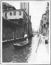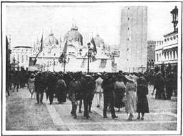The Doges' (Ducal) Palace was supported by columns of bricks; everywhere evidence could be seen of the attempt of the Italians to save the most remarkable city in the world. Inside the sumptuous Cathedral of St. Mark's, the effect was startling—all the works of art gone, the altar covered beyond recognition, mounds upon mounds of sand-bags heaped around the columns. It was more like a cave than the interior of one of the most beautiful of churches. Along the Grand Canal the large hotels have been converted into hospitals. Vast palaces have been closed and deserted. Life on the Canal is so quiet that it is almost painful. It is not the same Venice so many travelers recall. Only one good-class hotel is open. There are a few boarding-houses, but all the magnificent hotels are either closed or filled with wounded men.