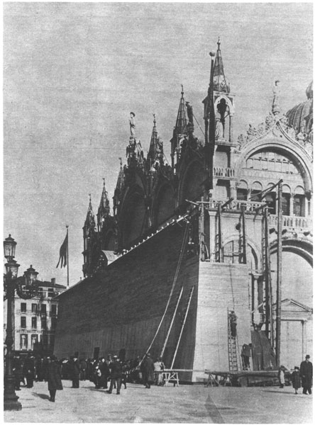 WHEN Italy entered the war, a commission was immediately appointed by the Government to consider measures for the protection of the country's art treasuries. Under the direction of the curators of galleries and museums, a civil engineer or architect was placed in charge of each principal building in all the art centers of northern Italy. The persons so appointed set about devising individual means adapted to the shielding of walls, towers, statues and pictures from attack by air and water, from shell and fire. In Venice the chief works and structures selected for protection were the Doges' (Dukes') Palace, with its rich arcades, sculptured façade and splendid halls, the superb Church of St. Mark, the medieval Loggetta, or vestibule, on the east side of the Campanile, the Church of St. John and St. Paul, the San Rocco School, the noble equestrian statue known as the Colleoni Monument, and the Academy of Fine Arts, with its canvases by Bellini, Carpaccio, Palma Vecchio, Tintoretto and Titian.
