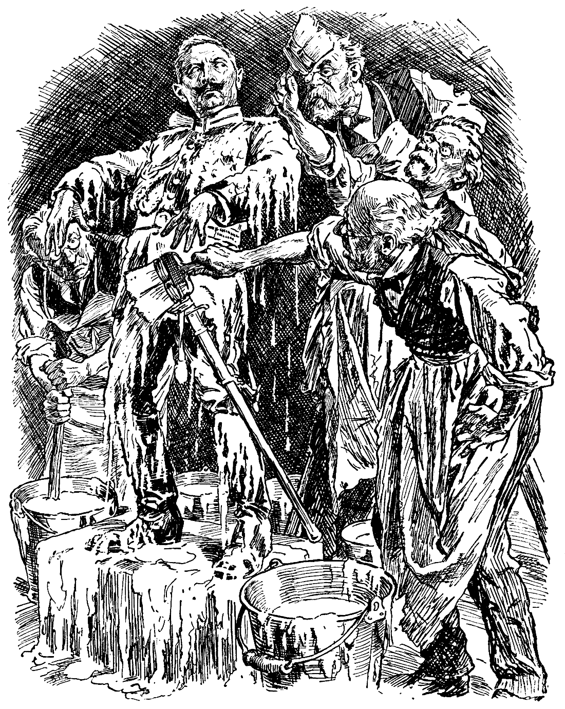 Fortunately the appointed day was fine and there was a great rush of spectators, who soon filled the hall to its utmost capacity. The entertainment began with a tribute to patriotism in the shape of tableaux vivants, all save one selected from the storehouse of our kind old friend Mr. Punch's cartoons. There, brilliantly and magnificently accoutred, was seen Britannia setting out to war for friendship and honour. There again we beheld brave little Belgium defying the German bully, and Holland succouring the refugees, and Belgium consoled by Liberty, and a final picture of Liberty blessing the Allies. All these were admirably represented, the immobility of the performers being not less remarkable than the splendour of their equipment; and enthusiasm was still further stimulated by the singing of the anthems of the various allied nations.